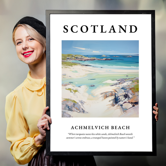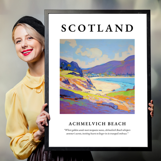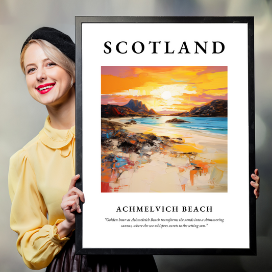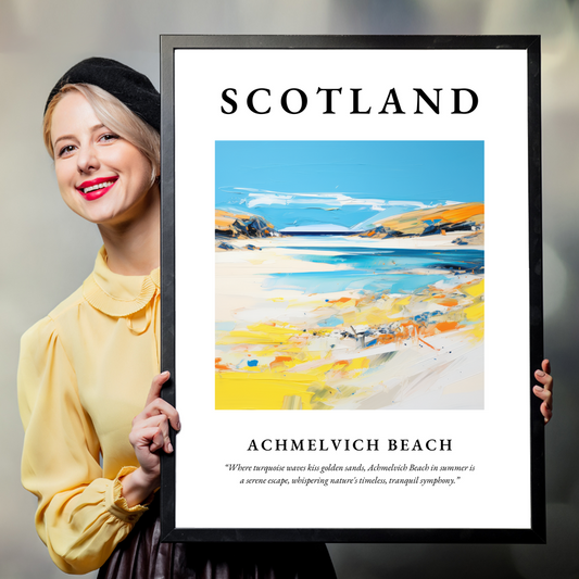 Our collection of high-quality framed prints from Achmelvich Beach beautifully captures these elements, making them an exceptional addition to any space. Opt for a classic, elegant look with a framed print in black, white, or natural wood. Each frame is meticulously crafted to complement the unique characteristics of every painting, protecting and enhancing the artwork while maintaining an aesthetic coherence that's sure to enrich your home decor. Whether it's the soft hues of a sunset or the vibrant blues of a midday sky, Achmelvich Beach prints offer an artistic escape to Scotland's serene coast.