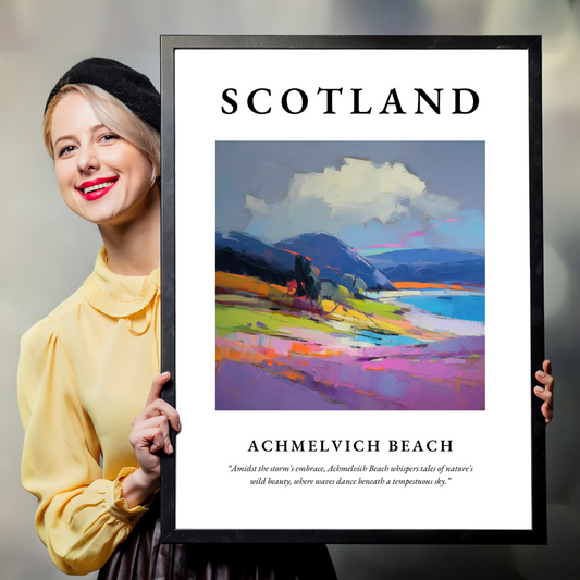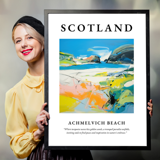 Our collection of high-quality framed prints from Achmelvich Beach beautifully captures these elements, making them an exceptional addition to any space. Opt for a classic, elegant look with a framed print in black, white, or natural wood. Each frame is meticulously crafted to complement the unique characteristics of every painting, protecting and enhancing the artwork while maintaining an aesthetic coherence that's sure to enrich your home decor. Whether it's the soft hues of a sunset or the vibrant blues of a midday sky, Achmelvich Beach prints offer an artistic escape to Scotland's serene coast.