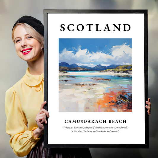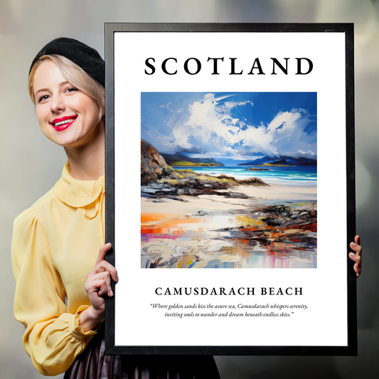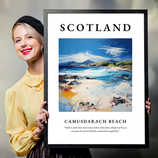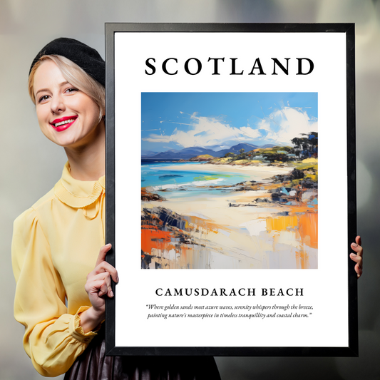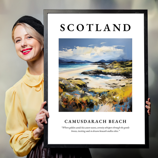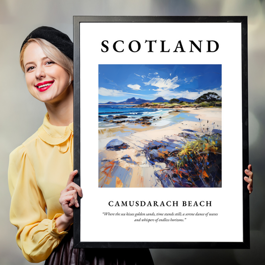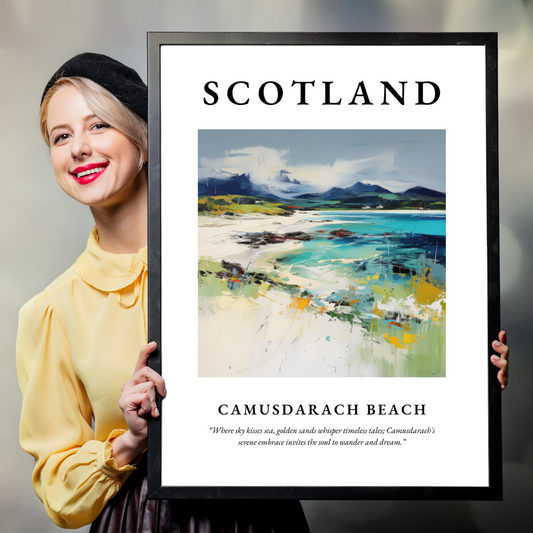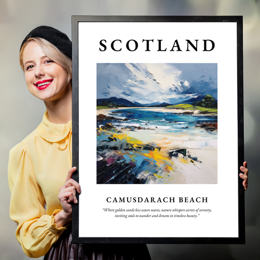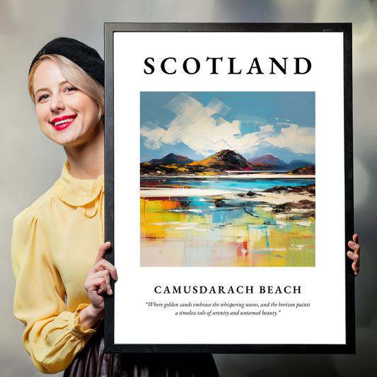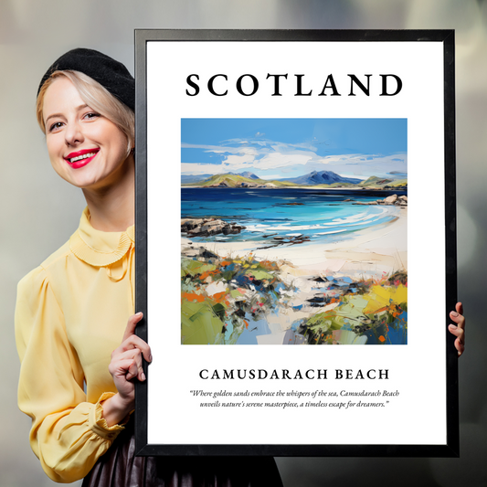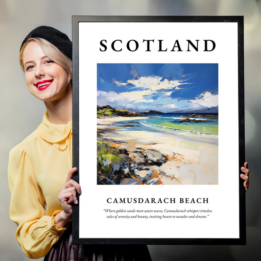 At our gallery, we understand the desire to capture a piece of this natural wonder. That’s why we feature high quality hand-stretched canvas prints of Camusdarach Beach, allowing you to bring the essence of Scottish beauty into your home or office. Our canvases, meticulously crafted to preserve the depth and texture of the original paintings, offer an immersive experience akin to gazing out upon the beach itself. Whether to embrace your love of the Scottish landscapes or to present an unforgettable gift, acquiring a canvas print of Camusdarach Beach promises to infuse any space with the romance and serenity of this coastal haven.