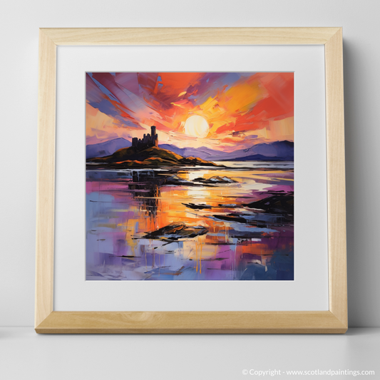Painting and Art Print of Castle Stalker Bay at sunset entitled "Sunset Blaze over Castle Stalker Bay".