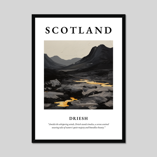Welcome to the captivating world of Driesh, where the rugged beauty of Scotland is encapsulated within every brushstroke and hue. Framed by the sky-piercing peaks of the Angus Glens, Driesh stands proudly as one of the most iconic Munros in Scotland, reaching a majestic elevation of 947 meters. As a beacon for adventurers and art enthusiasts alike, Driesh's raw and untamed landscape provides a perfect canvas for artists, embodying the natural allure of the Scottish Highlands.