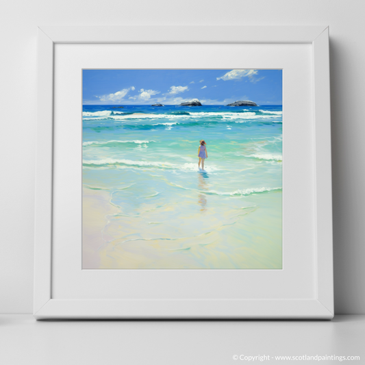 Painting and Art Print of A girl paddling in the sea at Tiree Beach entitled "Solitary Serenity at Tiree Beach".