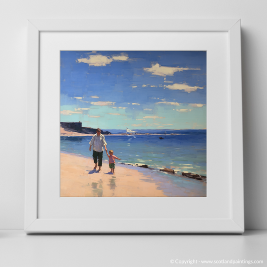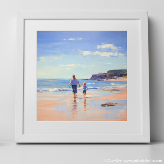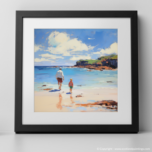 Painting and Art Print of A dad and son walking on Coldingham Bay entitled "Strolling on Coldingham Sands: An Impressionist Tribute to Fatherhood".
