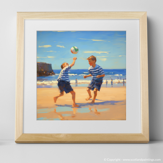 Painting and Art Print of Two boys playing beach volleyball at Burghead Beach entitled "Summer Frolics at Burghead Beach".