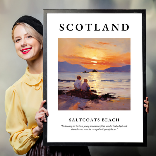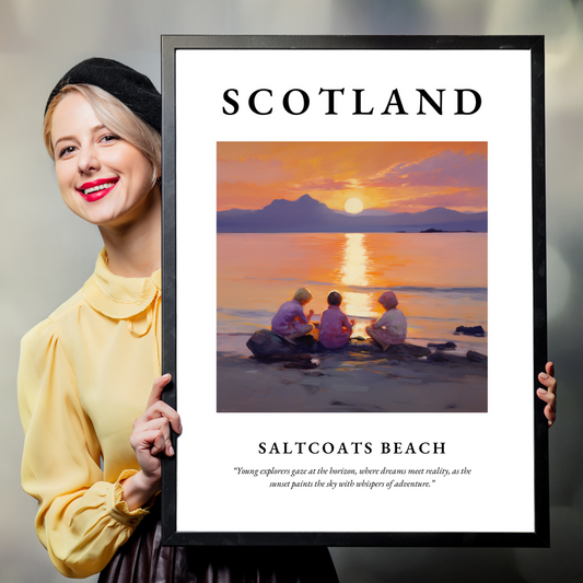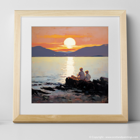 Painting and Art Print of Young explorers watching the sunset over the Isle of Arran from the peaceful Saltcoats Beach entitled "Sunset Serenade at Saltcoats Beach with the Isle of Arran".