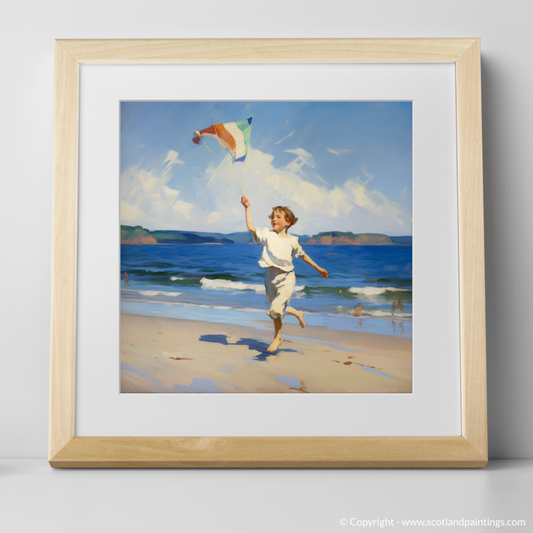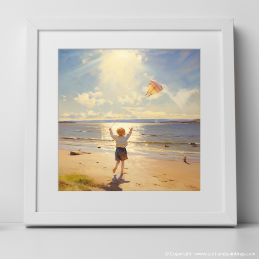 Painting and Art Print of A young boy flying a kite on the expansive shores of Nairn Beach, with the Moray Firth sparkling in the sunlight entitled "Kite Flying Bliss on Nairn Beach".