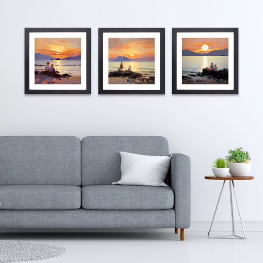 Young explorers watching the sunset over the Isle of Arran from the peaceful Saltcoats Beach - Set of Three Prints