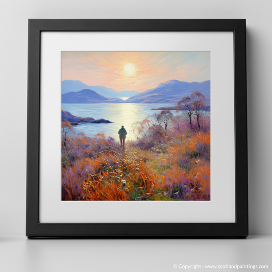 Painting and Art Print of Two hikers looking out on Loch Lomond entitled "Twilight Reverie: Hikers' Vista of Loch Lomond".