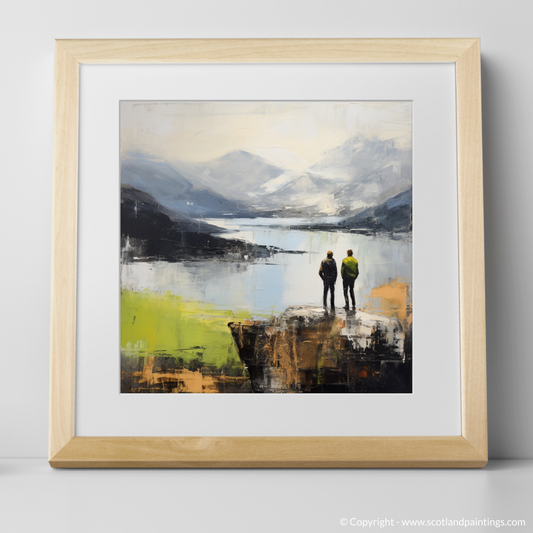 Painting and Art Print of Two hikers looking out on Loch Lomond entitled "Misty Horizons: An Abstract View of Loch Lomond".