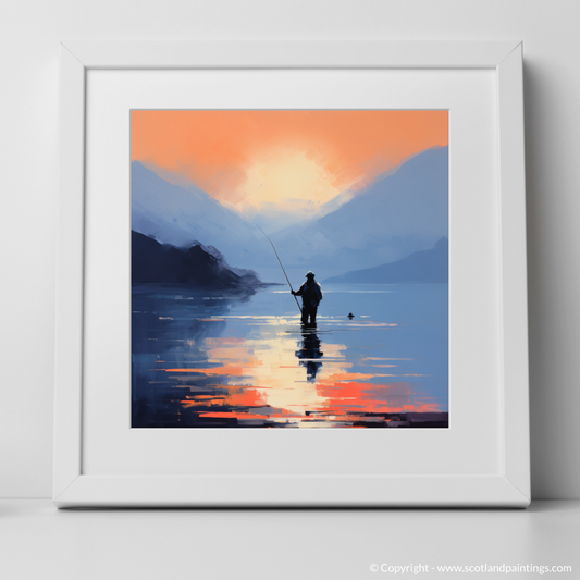 Painting and Art Print of Silhouetted fisherman on Loch Lomond entitled "Silhouetted Solitude at Dusk on Loch Lomond".