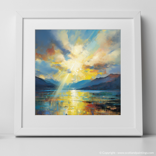 Painting and Art Print of Sun rays through clouds above Loch Lomond entitled "Radiance over Loch Lomond: An Abstract Expressionist Ode to Nature's Beauty".