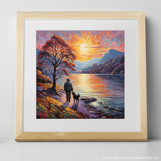 Painting and Art Print of A man walking dog at the side of Loch Lomond entitled "Strolling with Serenity at Sunset on Loch Lomond".