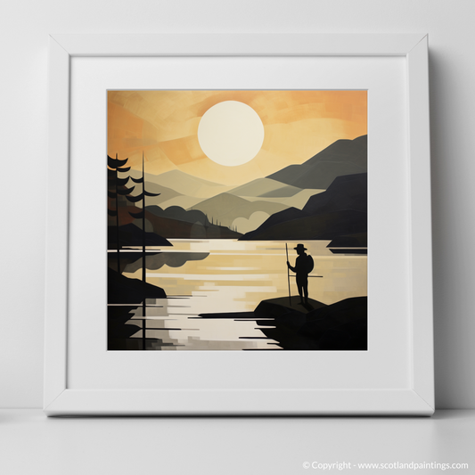 Painting and Art Print of Silhouetted fisherman on Loch Lomond. Silhouetted Fisherman at Dusk: A Cubist Loch Lomond Interpretation.