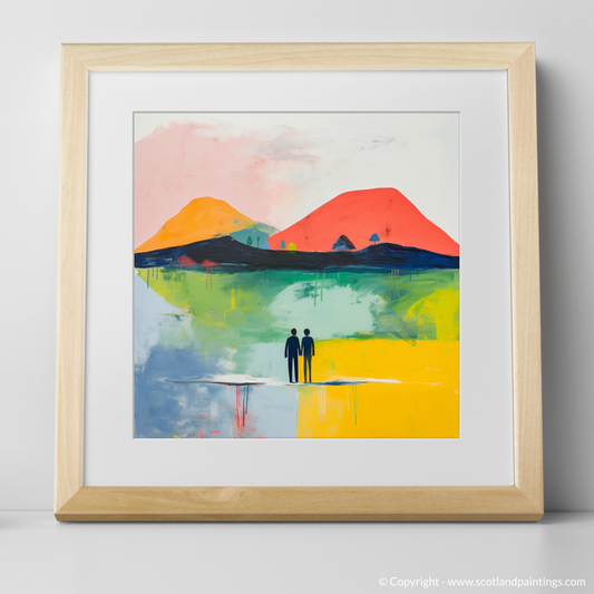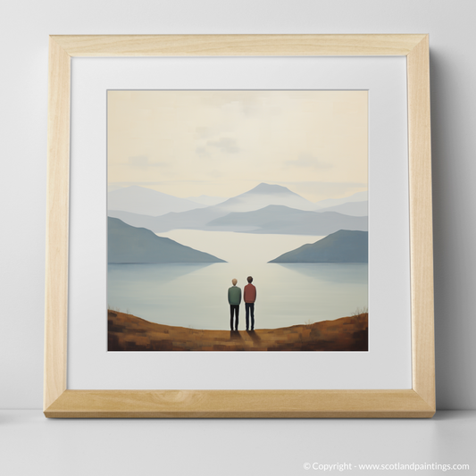 Painting and Art Print of Two hikers looking out on Loch Lomond. Hikers' Repose at Loch Lomond: A Minimalist Homage.