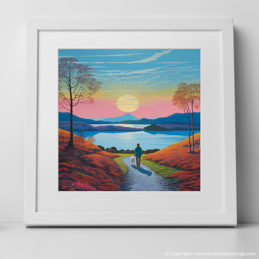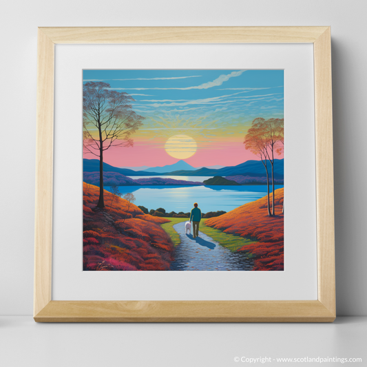 Painting and Art Print of A man walking dog at the side of Loch Lomond entitled "Walking the Twilight Path at Loch Lomond".