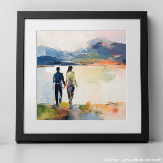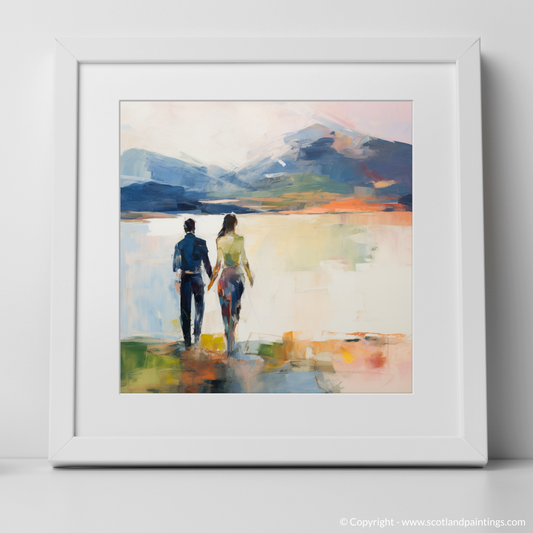 Painting and Art Print of A couple holding hands looking out on Loch Lomond entitled "Ethereal Embrace at Loch Lomond".