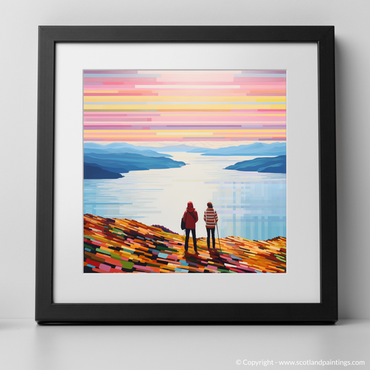Painting and Art Print of Two hikers looking out on Loch Lomond entitled "Hikers' Gaze on Abstract Loch Lomond".