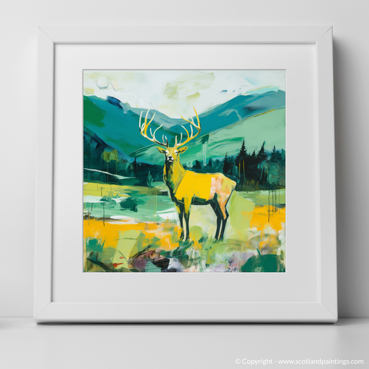 Painting and Art Print of A stag in Glencoe during summer. Majestic Stag of Glencoe: A Modern Scottish Summer Symphony.