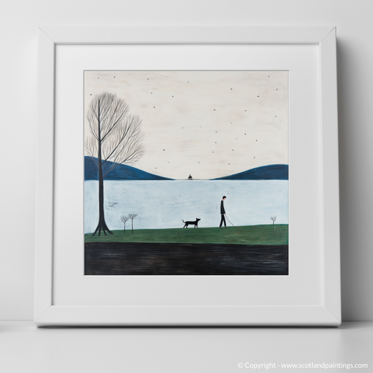 Painting and Art Print of A man walking dog at the side of Loch Lomond entitled "Leisurely Stroll at Loch Lomond: A Naive Art Tribute".