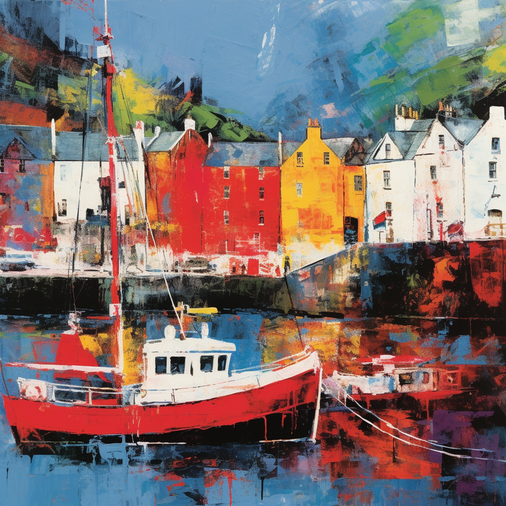 Nestled amidst the rugged landscapes of the Isle of Skye, Portree is a spectacular tapestry of natural splendour and cultural heritage that makes it a quintessential subject for exquisite paintings. This charming harbour town, with its quaint fishing boats and colourful waterfront houses, encapsulates a scene so serene and picturesque that it beckons artists and travellers alike. The intrinsic beauty of Portree, with its overarching sense of tranquillity, mirrors the classic essence found in Scottish landscape art.