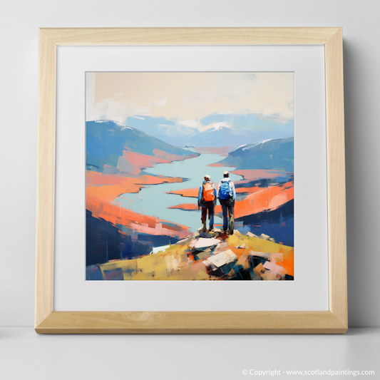 Painting and Art Print of Two hikers looking out on Loch Lomond entitled "Summit Spectacle over Loch Lomond".