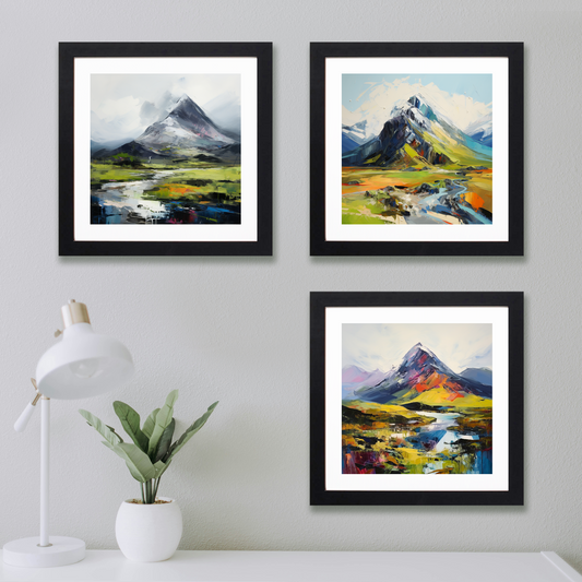 Our artists have lovingly reproduced some of the most iconic and beloved Munros in a range of styles, from the misty morning hues of Ben Nevis to the fiery sunset skies over The Cuillin on the Isle of Skye. These paintings not only embody the varied seasons of Scotland but also evoke the emotions and memories of those who've walked these trails and those who dream to.