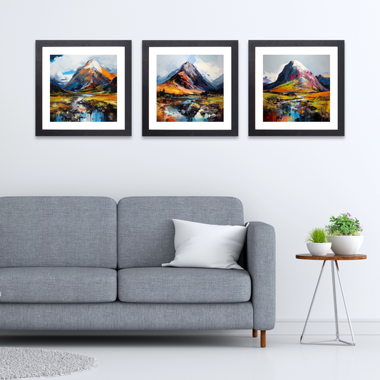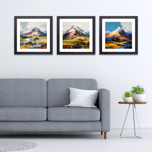 Our Scottish Munros collection offers a unique opportunity to celebrate these natural wonders within your own space. Whether you opt for a high-quality framed print, selecting from black, white, or natural wood frames to match your décor, or prefer the texture and immersion of a hand-stretched canvas print, each piece brings a touch of Scotland's enduring spirit into your home or office.