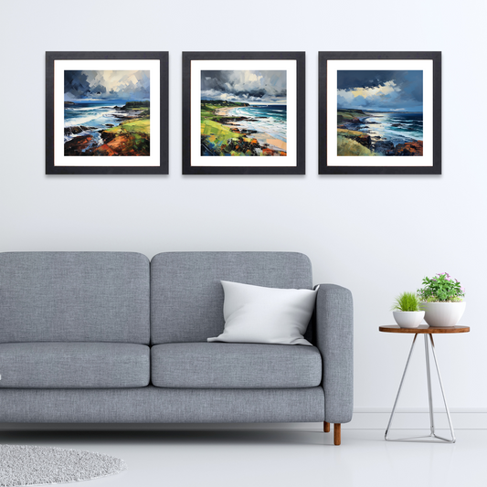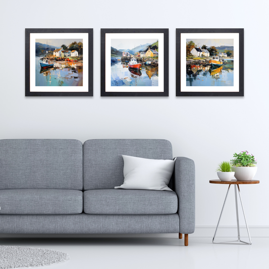 - Cohesive Design: Each trio of prints is carefully selected to work together, featuring themes such as Scotland’s serene harbours, dramatic coasts, and tranquil lochs.