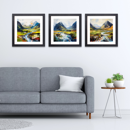 At ScotlandPaintings.com, we are passionate about bringing Scotland’s natural beauty into your home through stunning artwork. Our sets of three framed prints are a fresh and unique way to celebrate Scotland's landscapes. Carefully curated, these sets are designed to create a cohesive and striking feature for your walls.