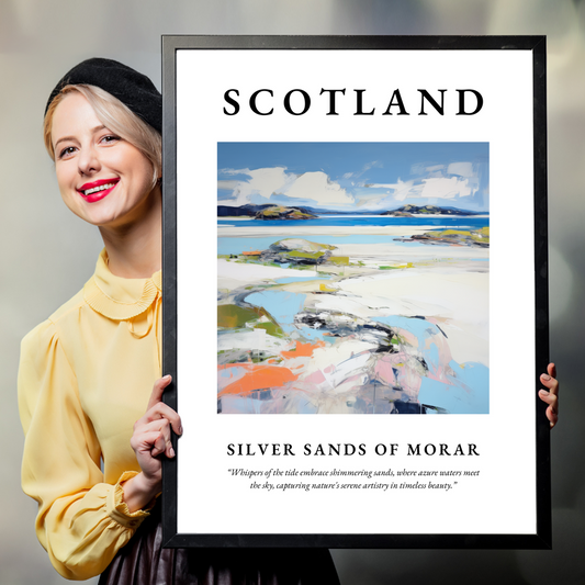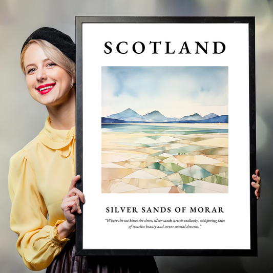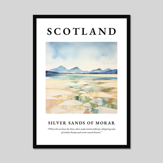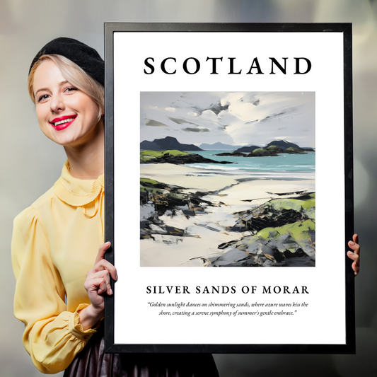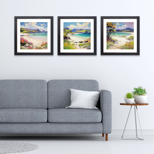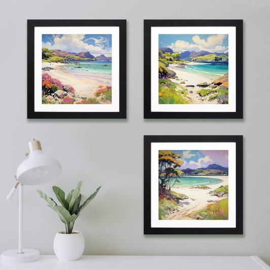Welcome to the shimmering shores of the Silver Sands of Morar, a stretch of idyllic coastline that boasts some of Scotland's most breathtaking vistas and serves as an unparalleled muse for artists and photographers alike. Nestled in the Highlands, the Silver Sands are renowned for their gleaming white sands, crystal-clear turquoise waters, and panoramic views of the Small Isles. This ethereal landscape, where the sky meets the sea, creates a serene harmony that is mirrored in each lovingly crafted painting available on our site.