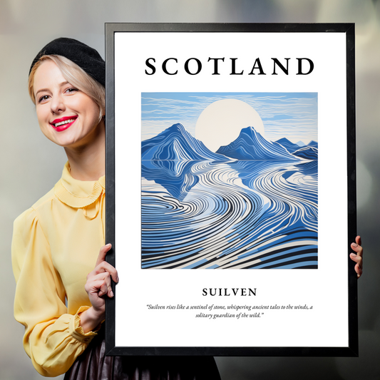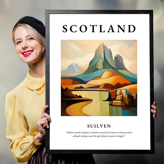 The constantly shifting light and weather around Suilven can transform the mountain's mood in an instant, offering an array of dramatic vistas for artists. The play of light across the craggy slopes and the deep shadows cast in the setting sun create a chiaroscuro effect that resonates with the dramatic and romantic art styles. Its magnificent presence lends itself effortlessly to the creation of compelling and evocative works of art that are a testament to the enduring allure of the Scottish Highlands.