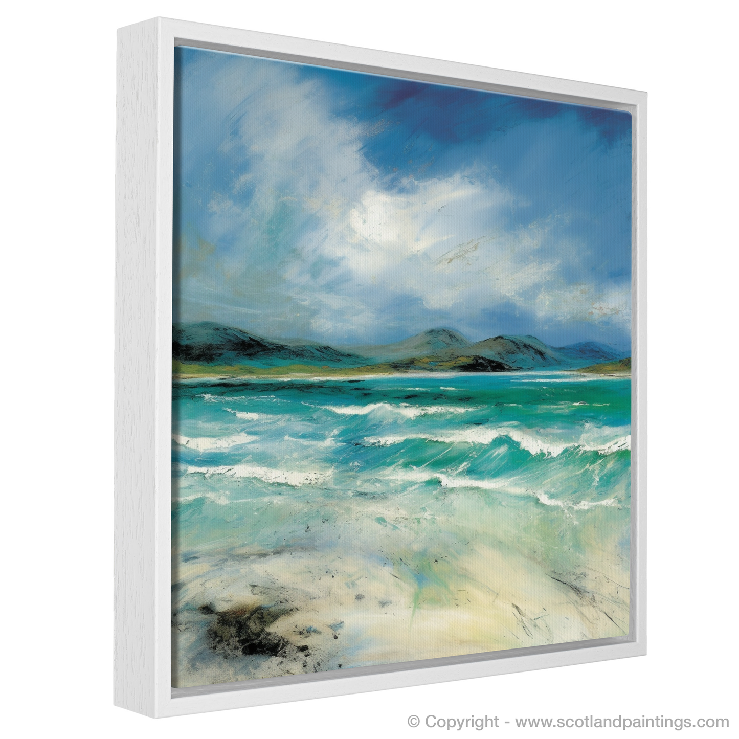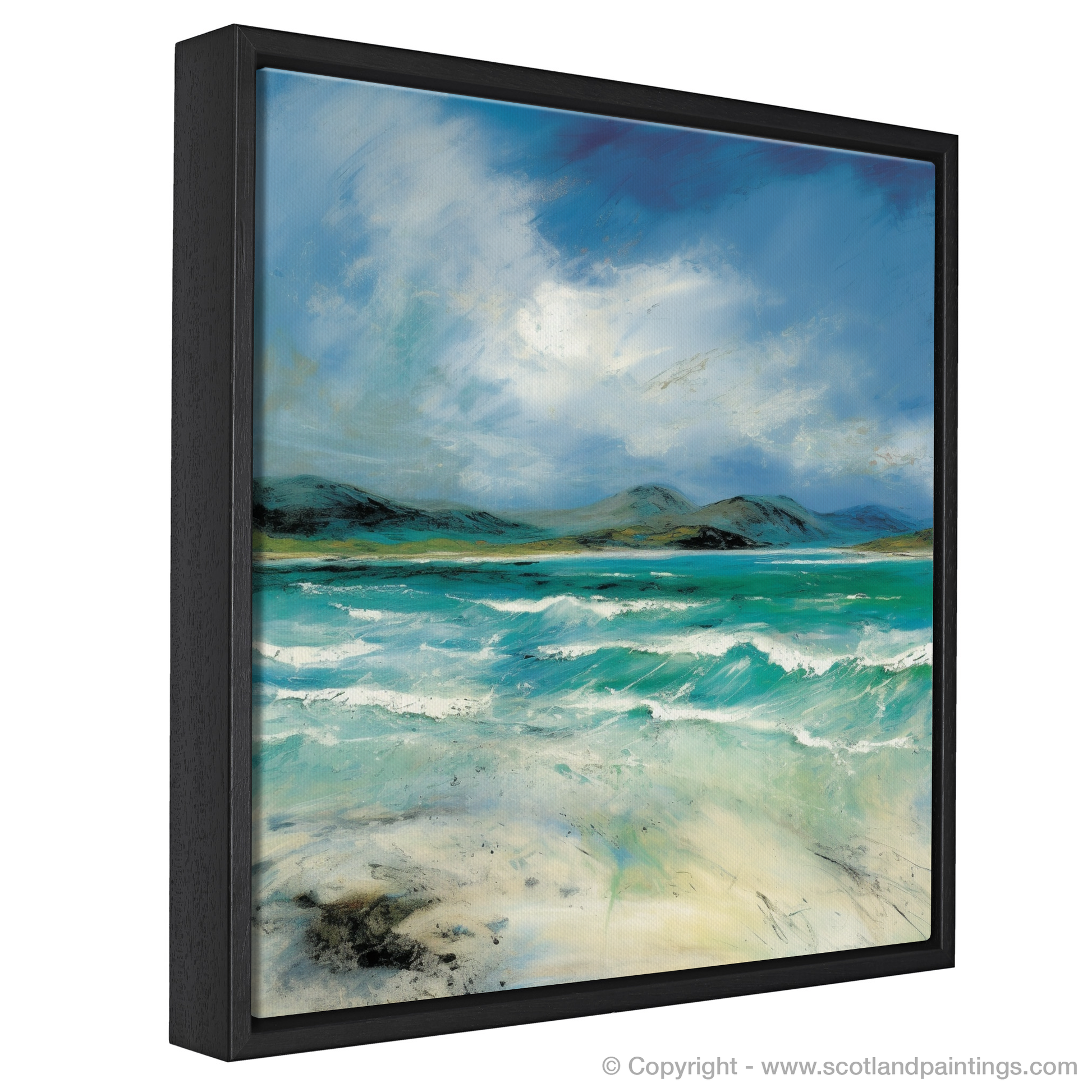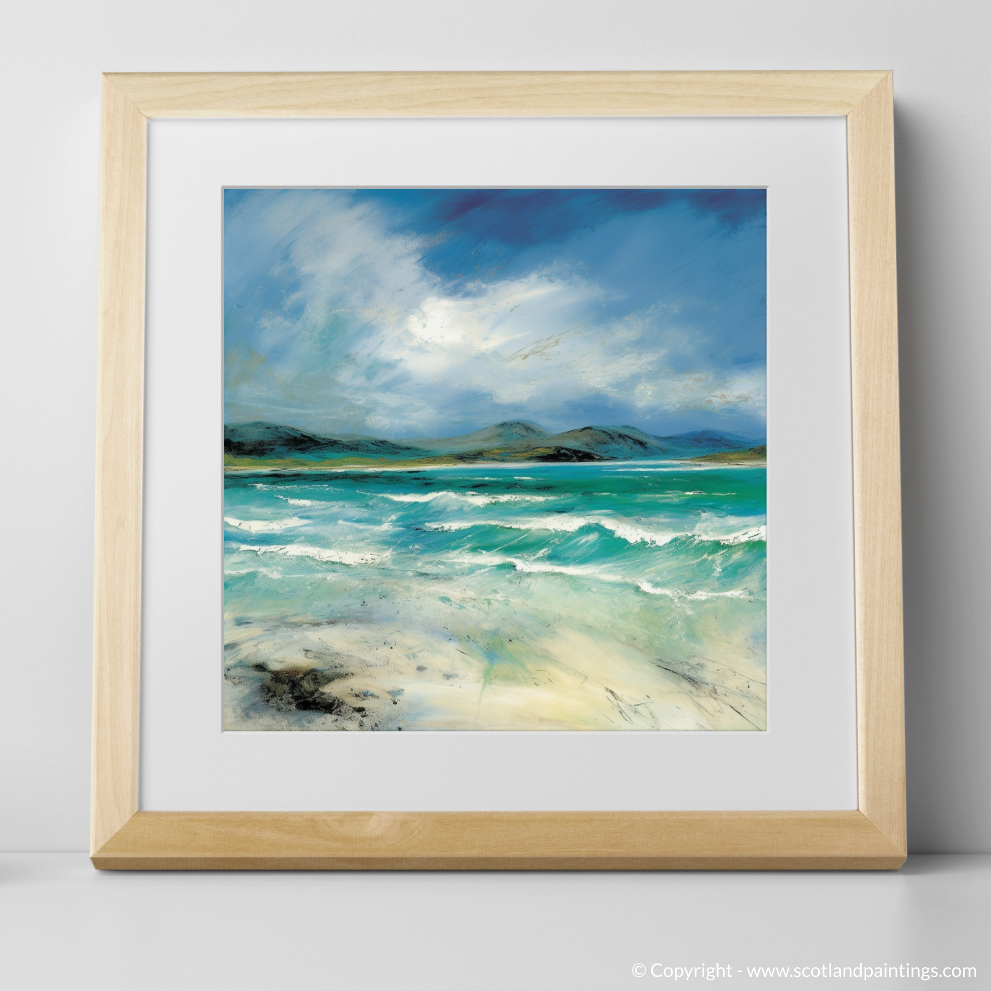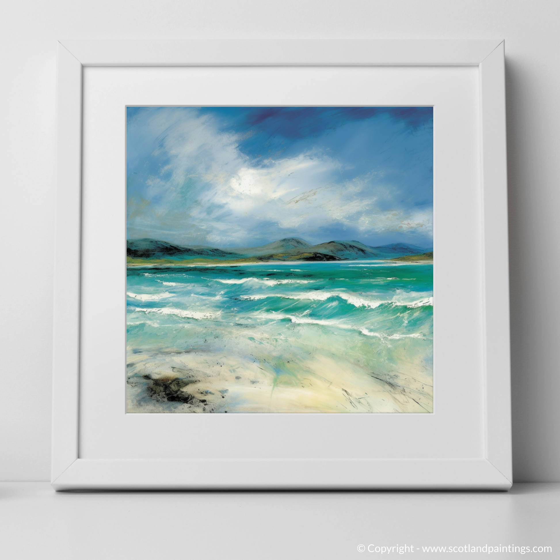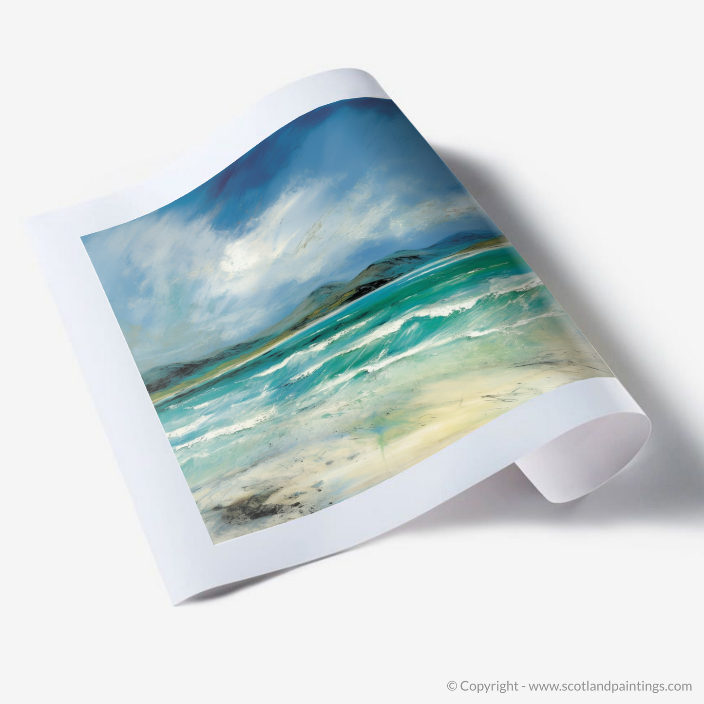The artwork teems with a vibrant energy as an array of teals, cerulean, and azure mimic the capricious waves of the sea. The foaming crests of the waves seem to dance in harmony with the wind, each brushstroke contributing to a palpable sense of movement. Hues of blue transitions to the shoreline, where the mingling of sandy tones and dark, speckled accents depict the unique, golden sands of Luskentyre that meet the North Atlantic's briny waters.
