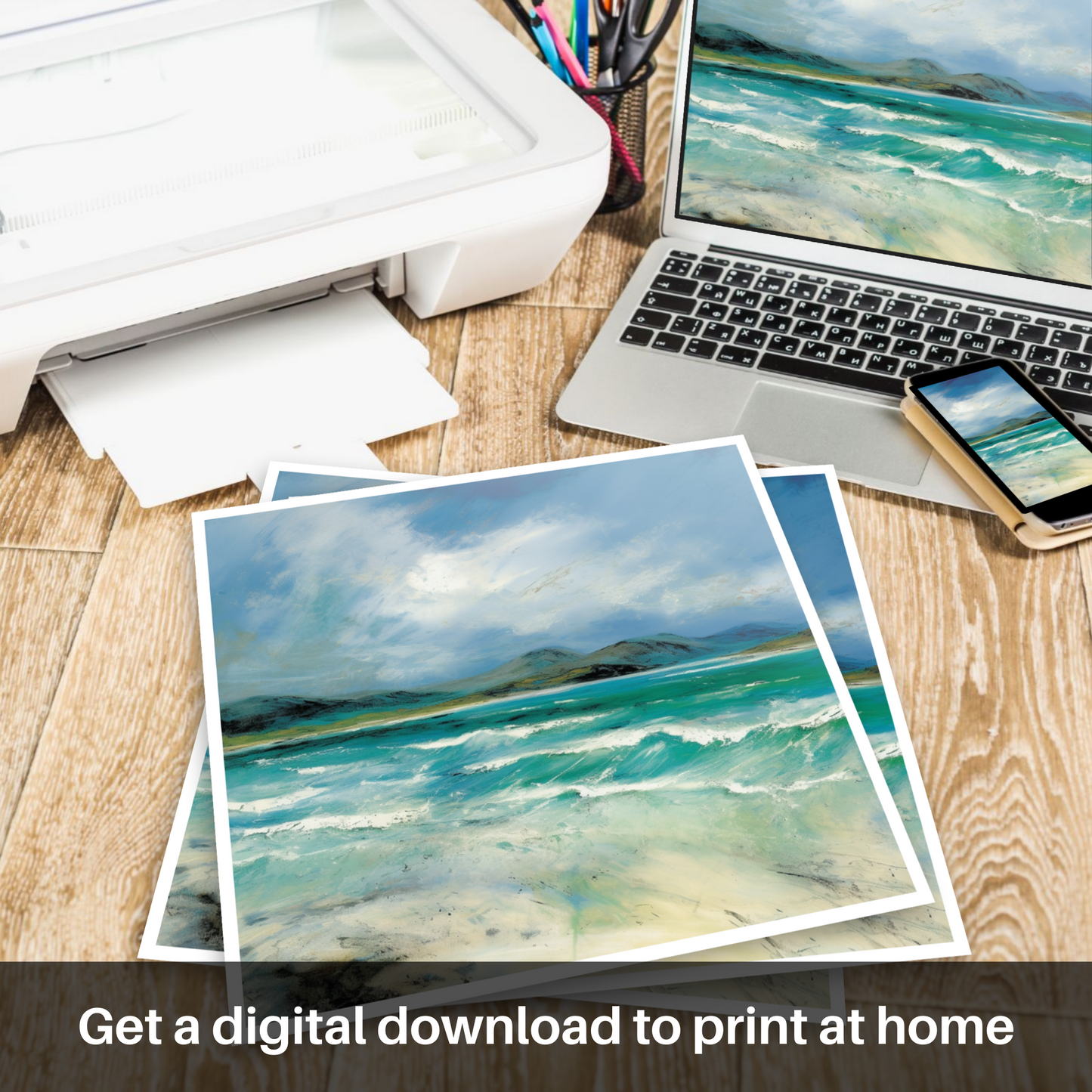 This print offers an abstract lens through which the majesty and atmosphere of Scotland's coastal gem is both celebrated and reimagined. It is a tribute to the wild, untouched spirit of Luskentyre Beach, inviting contemplation and inspiring the soul with its bold, painterly portrayal of land meeting sea, under the ever-changing Hebridean sky.