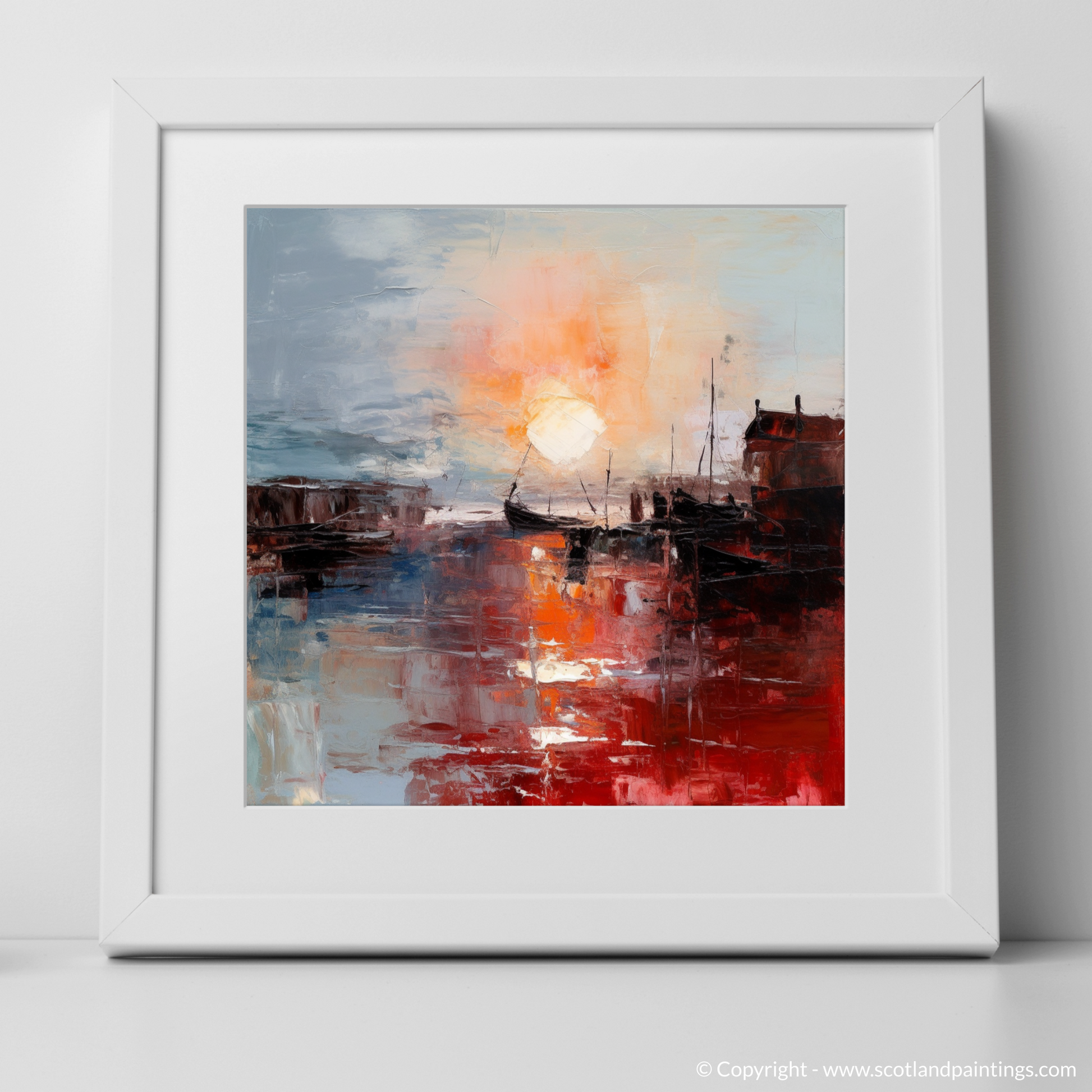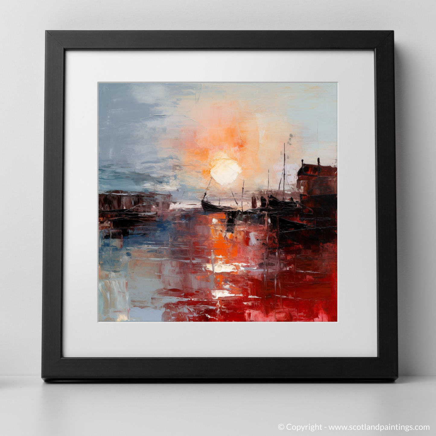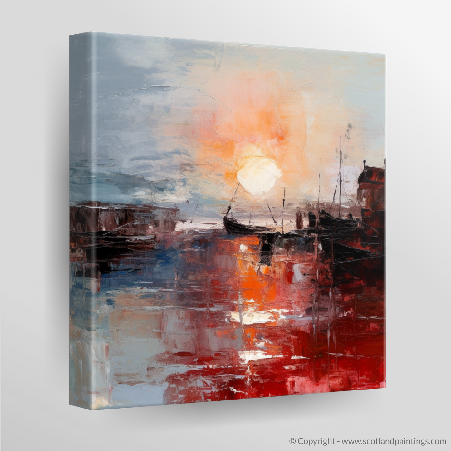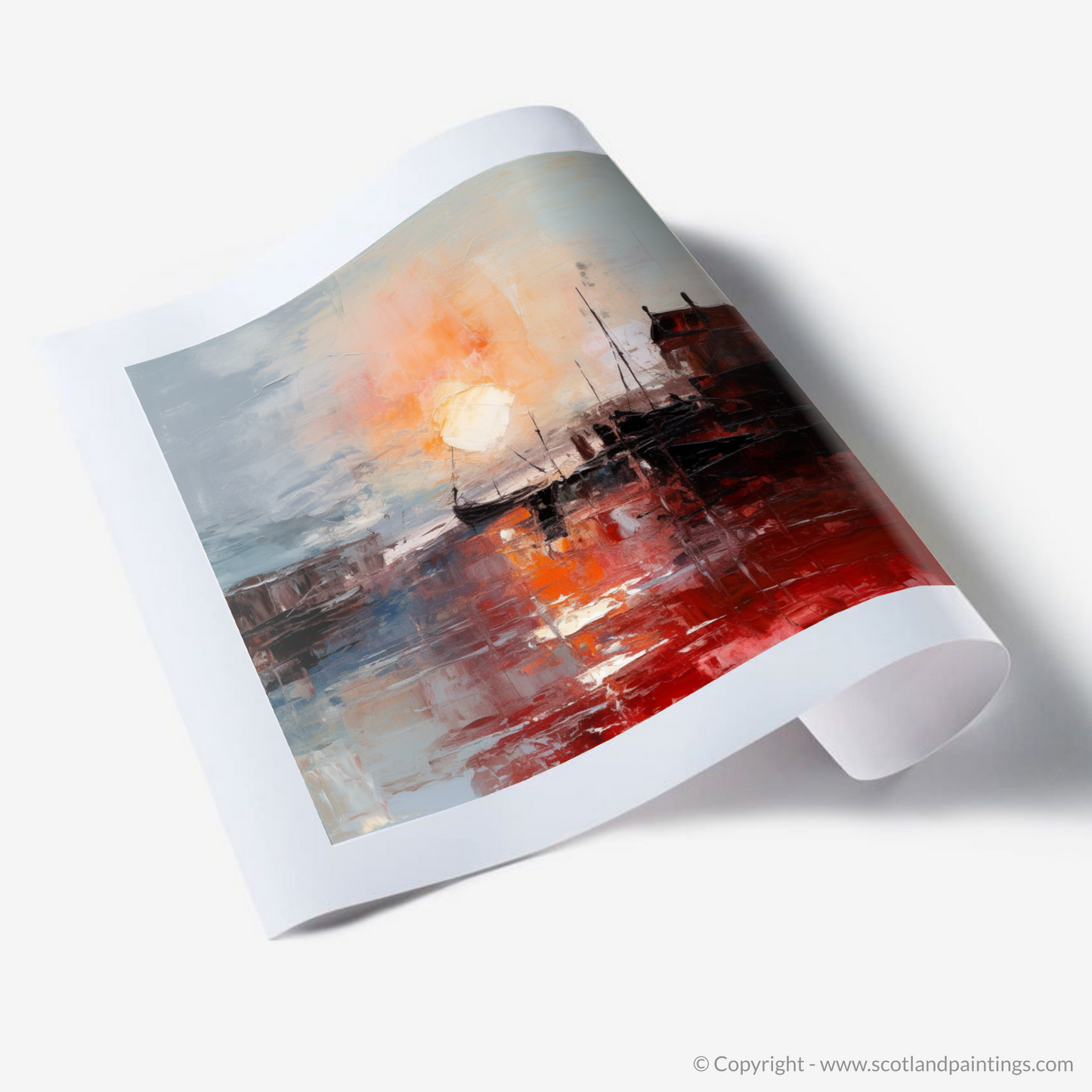 Bathed in the fiery glow of a setting sun, this evocative abstract rendition captures the serene yet commanding presence of Eyemouth Harbour in a moment of twilight splendour. The artwork masterfully blurs the lines between reality and imagination, inviting the viewer on a sensory journey through one of Scotland's picturesque seascapes.