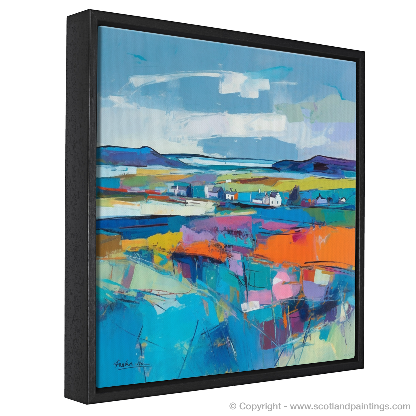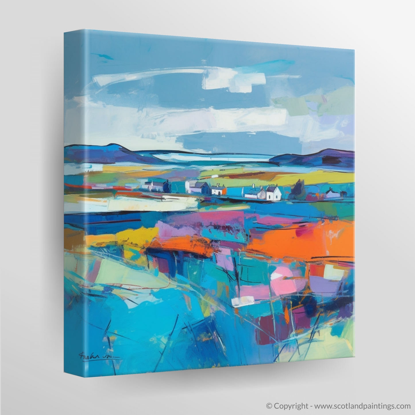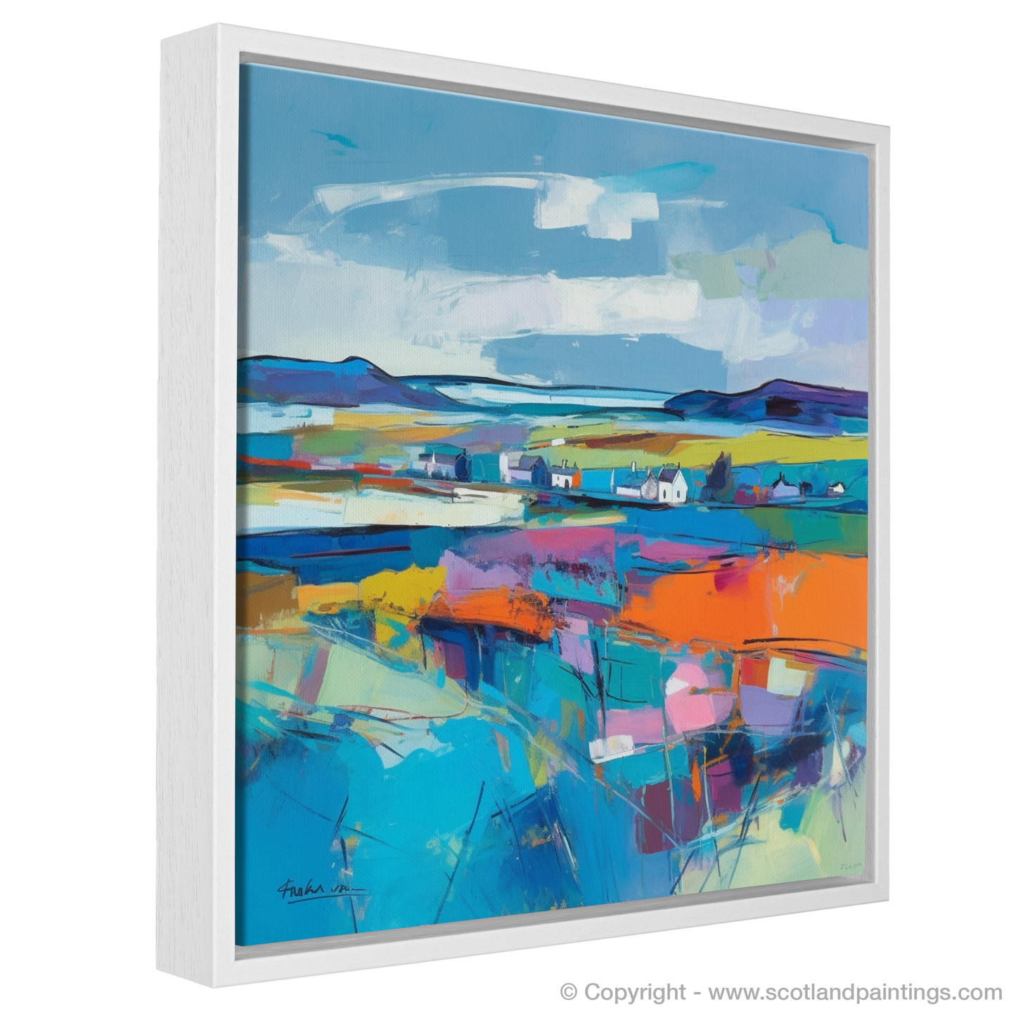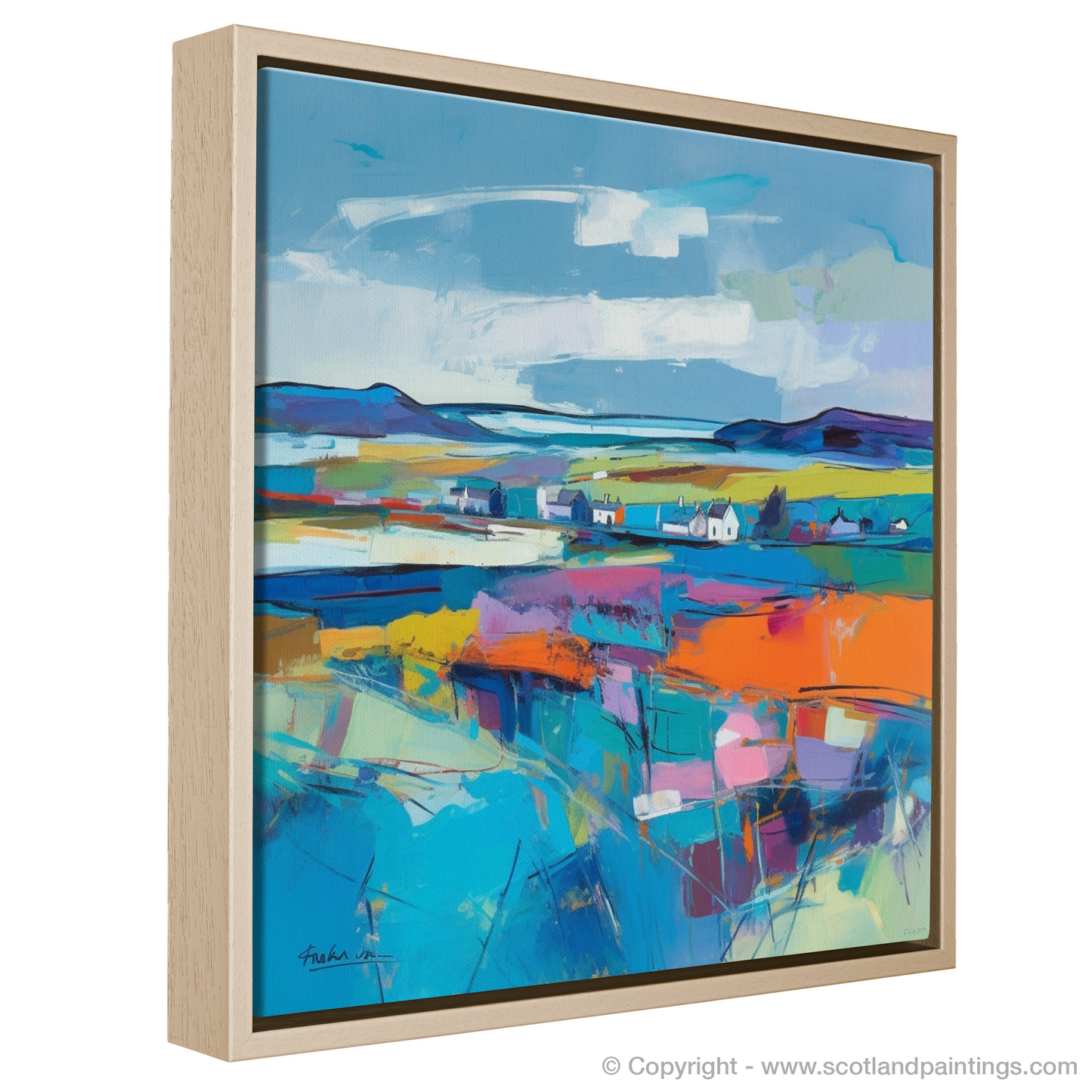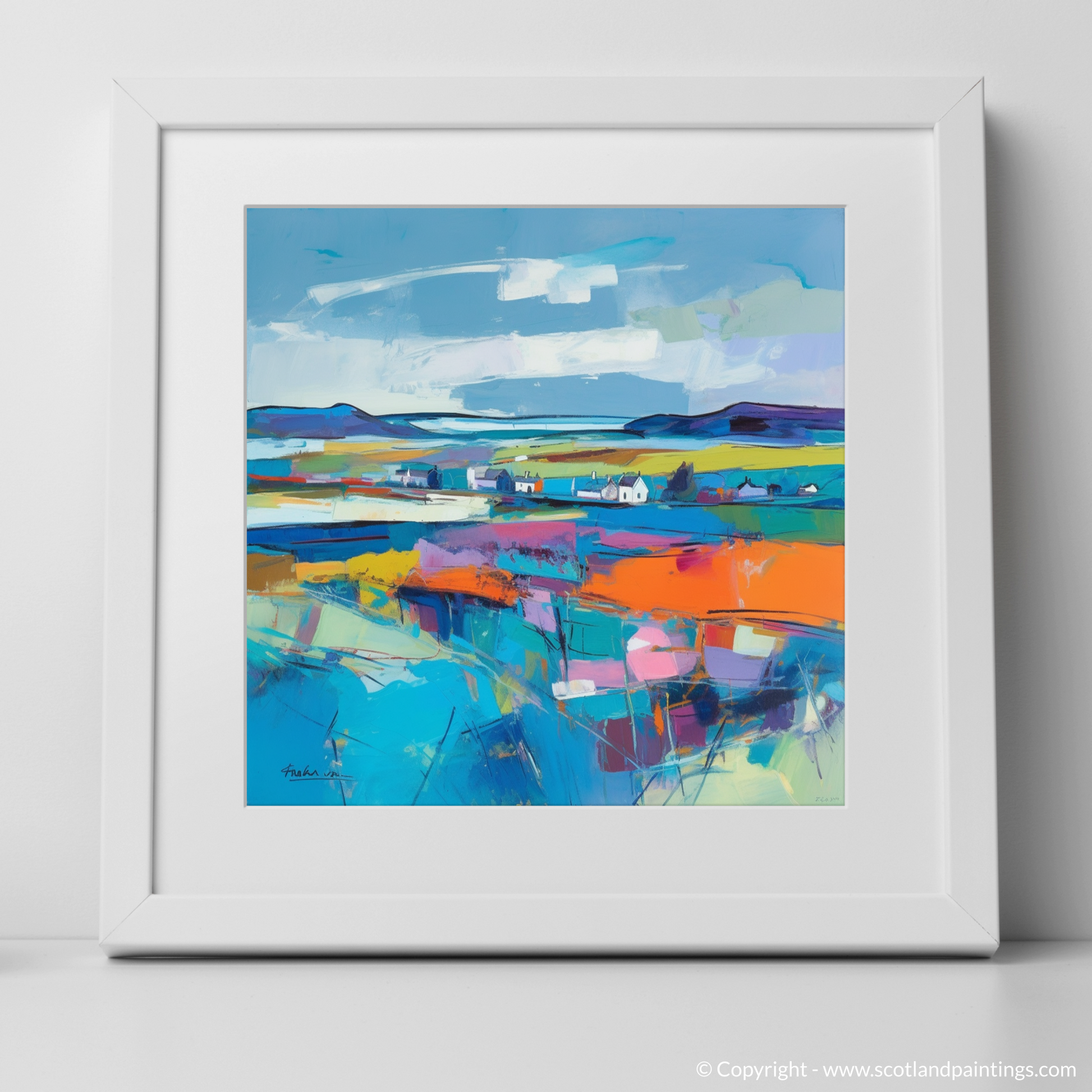 The foreground throbs with life, featuring intense patches of fiery oranges and soothing lavenders, hinting at the wildflowers and heather that pepper the island's terrain. Harmonious splashes of white break the continuity of the colour planes, adding dynamic motion to the scene, reminiscent of the ebb and flow of the Hebridean tides. Simplified structures interspersed throughout the composition pay subtle homage to the quaint houses and villages that dot the shores of Lewis, grounding the print in a specific sense of place.