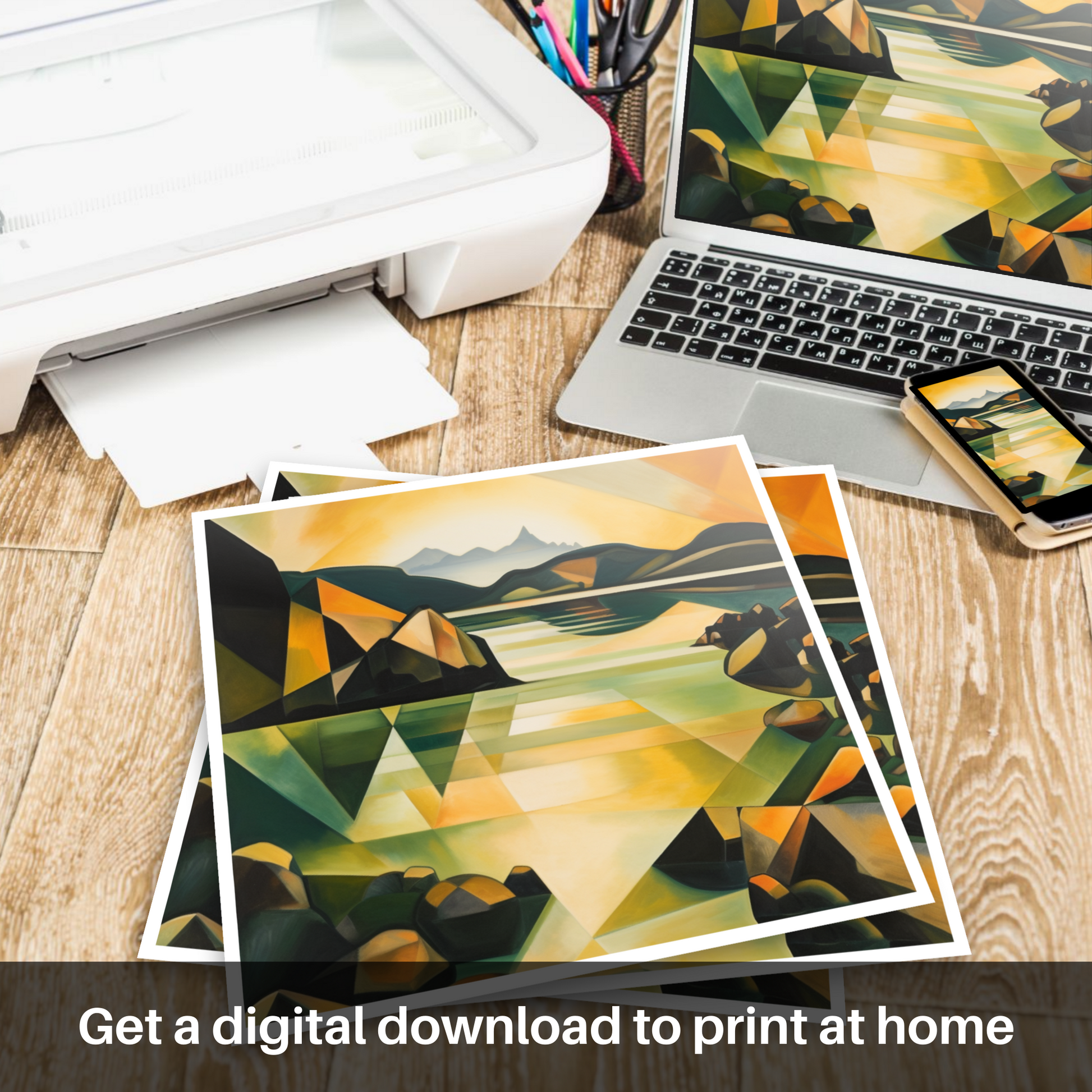 The composition bristles with angular dynamism, with the shapes distilling the natural world into a tapestry of stylised forms. Rolling hills and rugged topography come alive through an array of earthy greens and bold blacks, while the golden sky, depicting the hour when the sun kisses the horizon, casts an amber hue across the waters and skies. The reflections dance upon the sea's surface, rendered in a chequerboard of light and shadow that evokes the tranquillity of gently lapping waves.