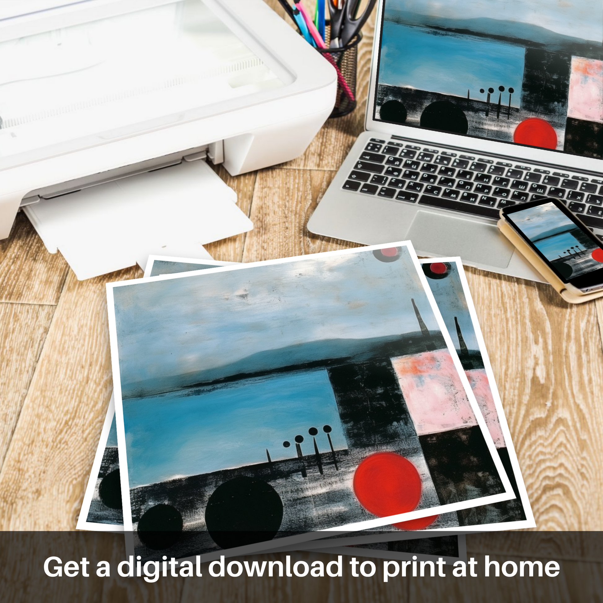 The abstract elements—geometric shapes and symbols scattered across the foreground—offer an imaginative interpretation of the coastal scenery. Dark, rounded forms suggest the smooth, pebble-lined shore, and stark vertical lines hint at the elusive, wind-swept grasses. A singular vibrant red circle stands out as a focal point, perhaps mirroring the intense heart of the storm or the sun's orb scarcely visible in the sky.