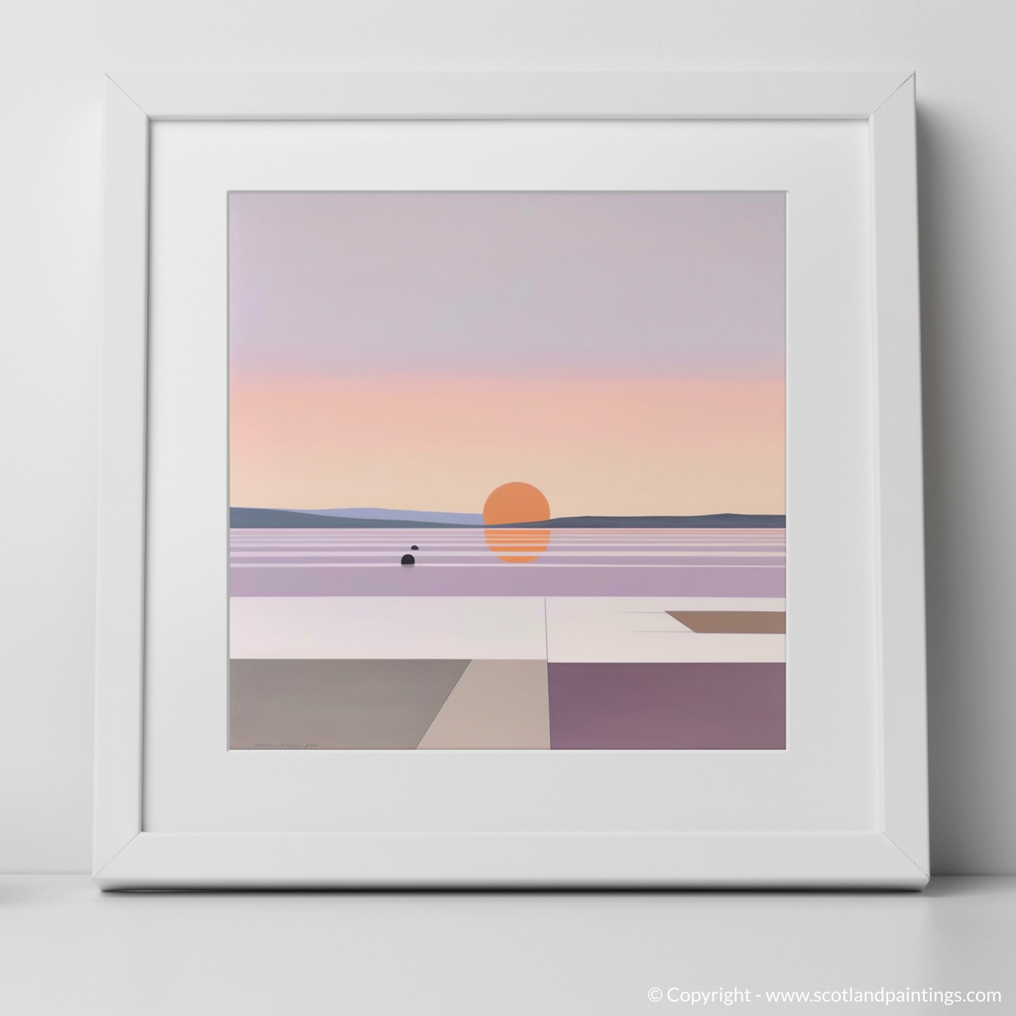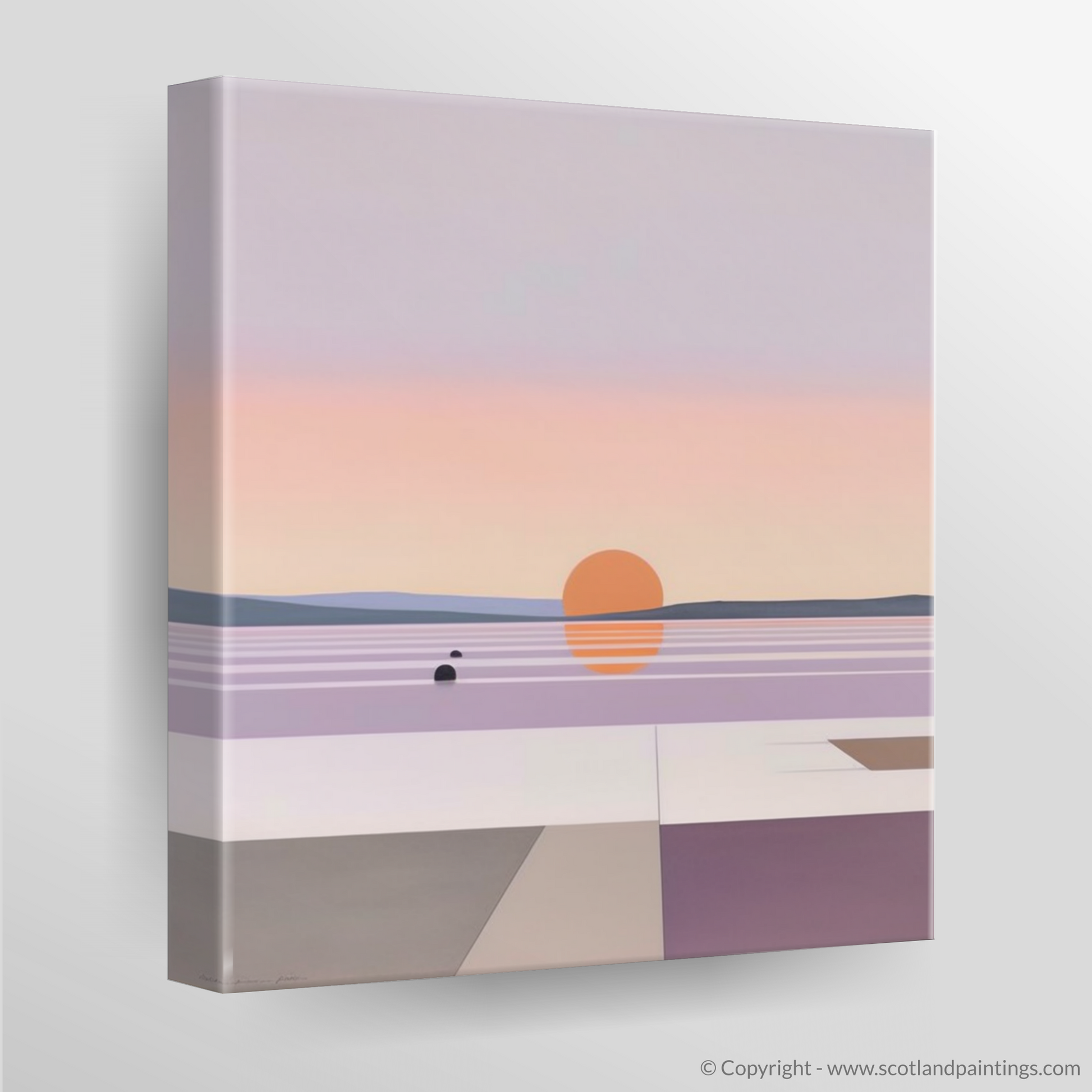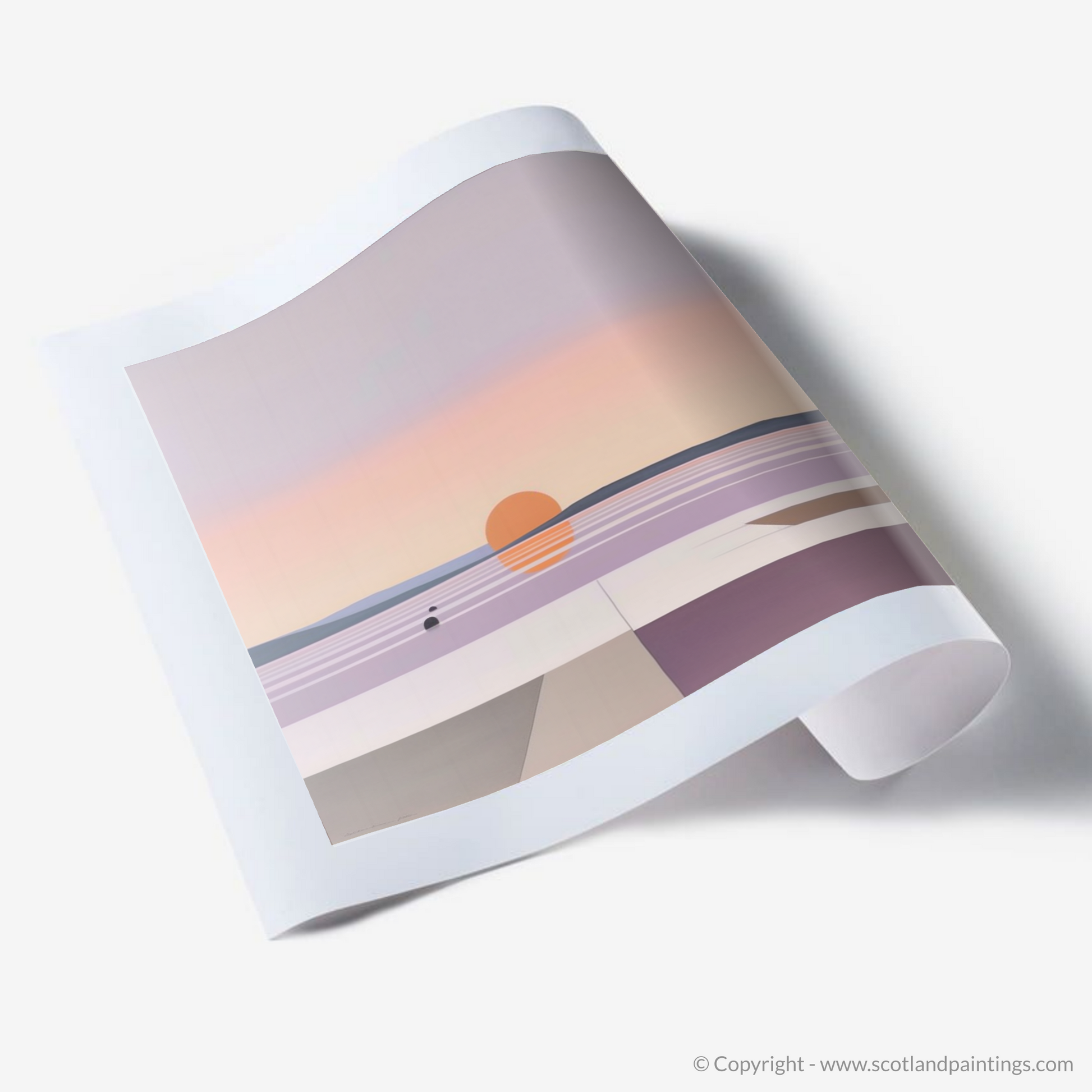 Capturing the tranquil essence of Nairn Beach, this enchanting piece offers a serene representation of the sun bidding adieu to the Scottish shores. The comforting minimalism invites viewers to bask in the simplicity and purity of the scene, where the calm horizon meets the gentle undulations of the sea. As if drawn from a contemplative daydream, the sun's descent is elegantly echoed in the whispery, peach-hued reflections that dance atop the water's textured surface.