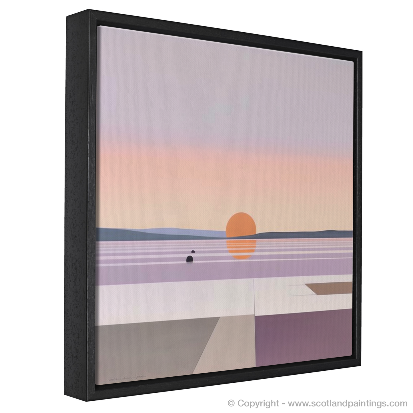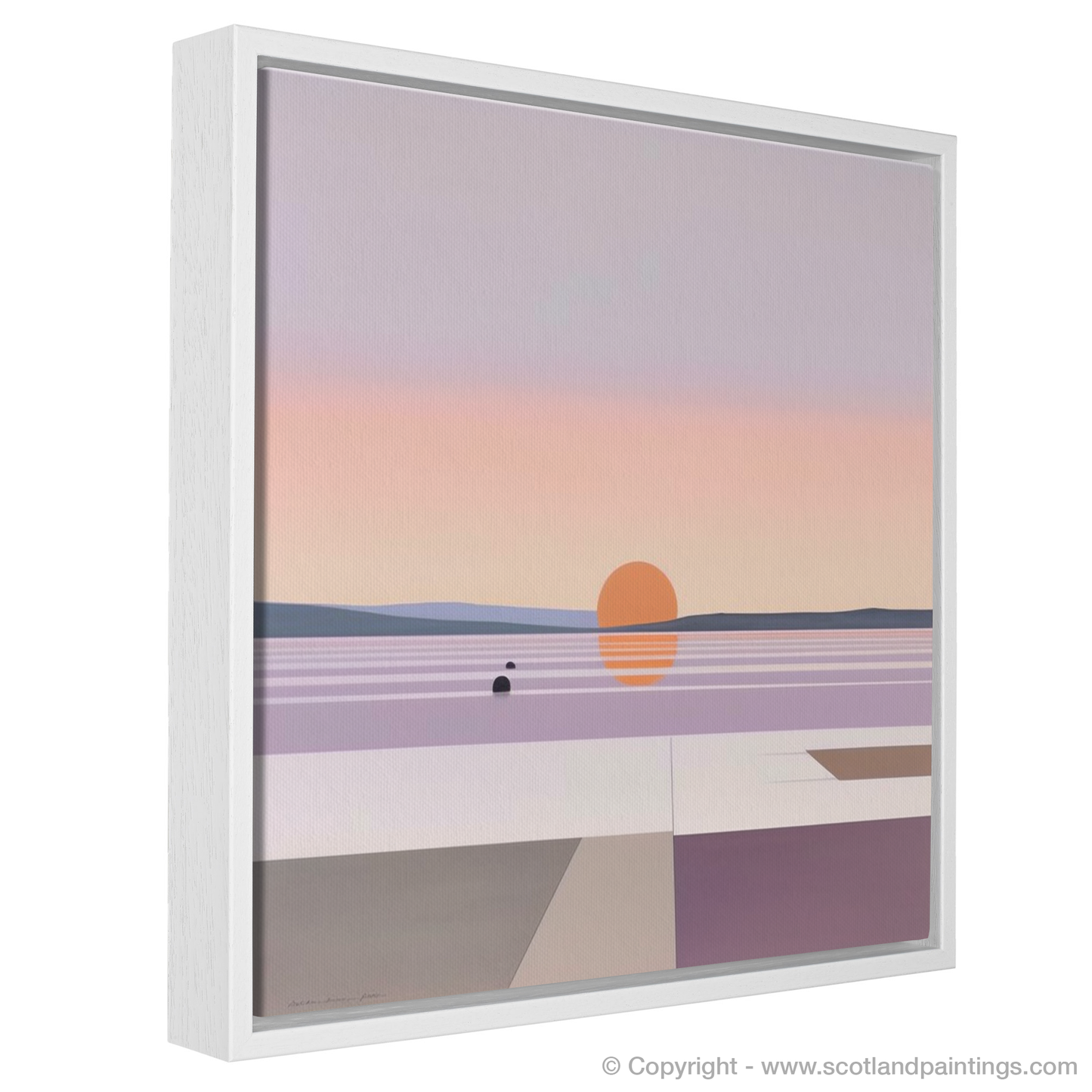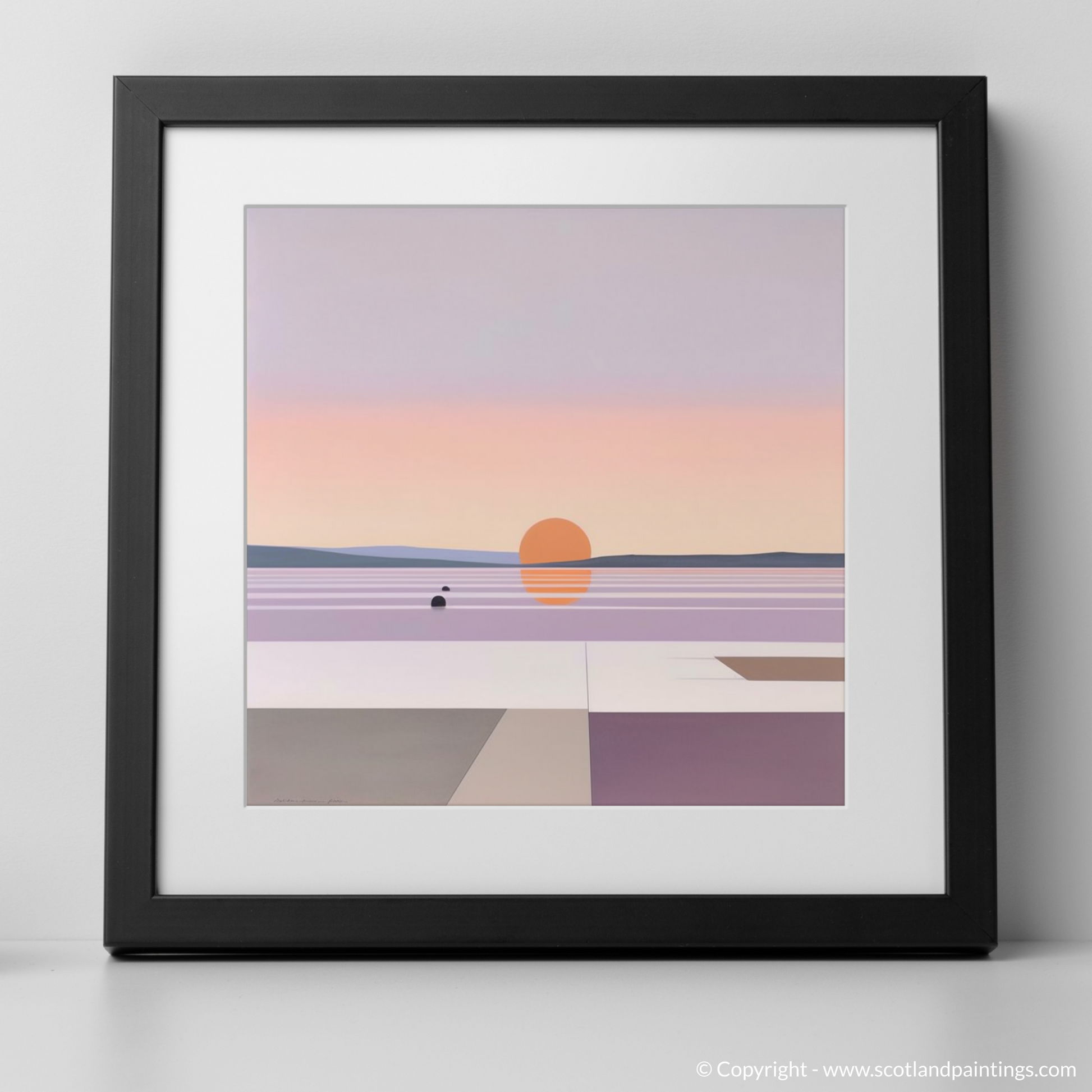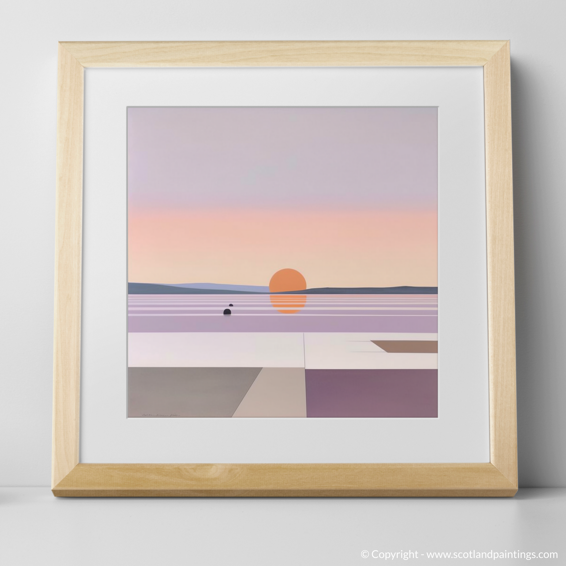 Capturing the tranquil essence of Nairn Beach, this enchanting piece offers a serene representation of the sun bidding adieu to the Scottish shores. The comforting minimalism invites viewers to bask in the simplicity and purity of the scene, where the calm horizon meets the gentle undulations of the sea. As if drawn from a contemplative daydream, the sun's descent is elegantly echoed in the whispery, peach-hued reflections that dance atop the water's textured surface.