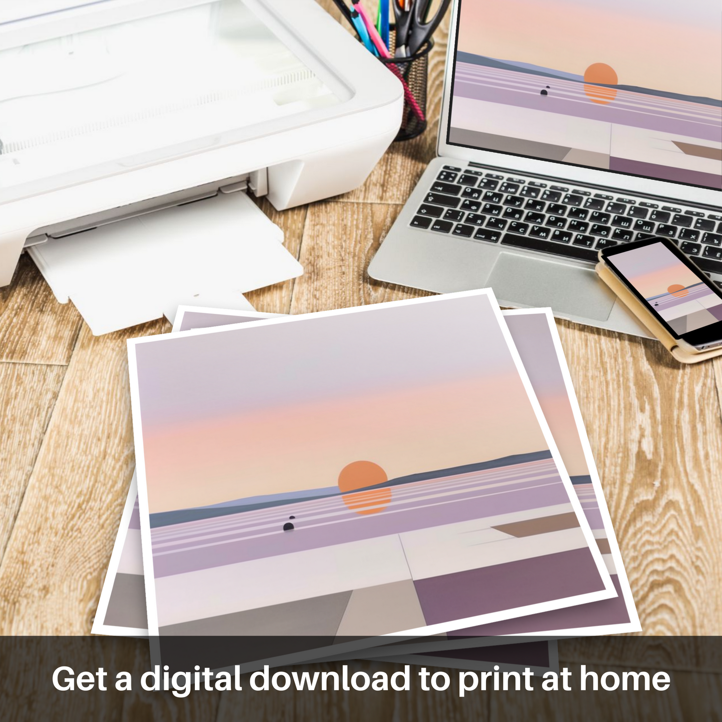 With precision, the print distinguishes itself through a harmonious palette of soft lavenders, muted greys, and subtle earth tones, segmented into geometric forms that suggest the beachfront's quiet splendour. The celestial orb at the centerpiece in warm gradients of orange provides a focal point that emanates a delicate warmth, counterbalancing the coolness of the surrounding landscape.