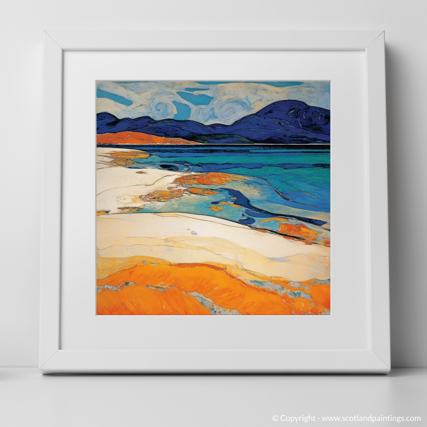 Captured within this enchanting print is the unmistakable charm of Traigh Mhor, a picturesque beach on the Isle of Barra, rendered with the whimsical flourish characteristic of the Art Nouveau style. The work invites onlookers to traverse the ivory sands fringed by a mosaic of fiery orange seaweed, where the shoreline gracefully dances with the ebb and flow of azure waters.