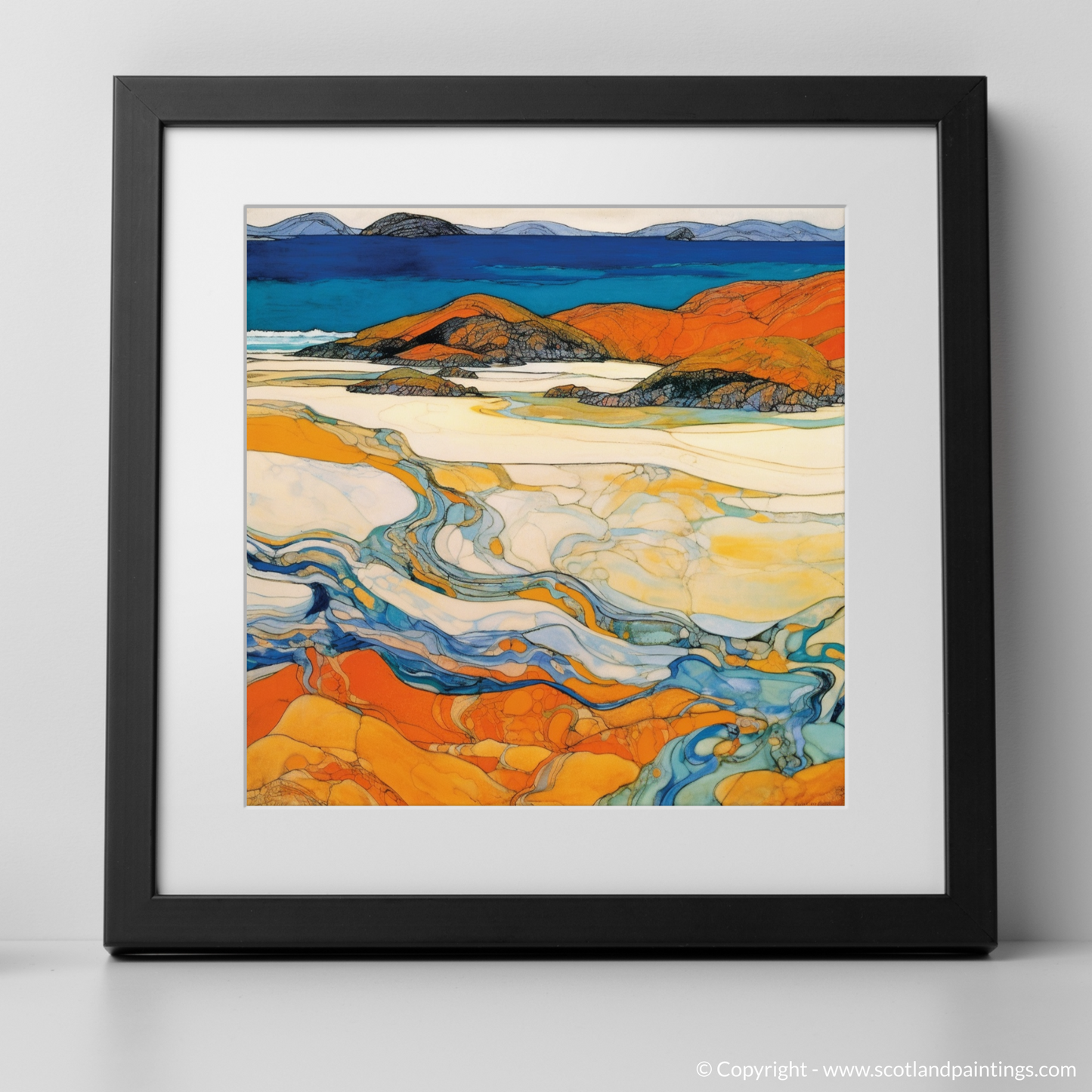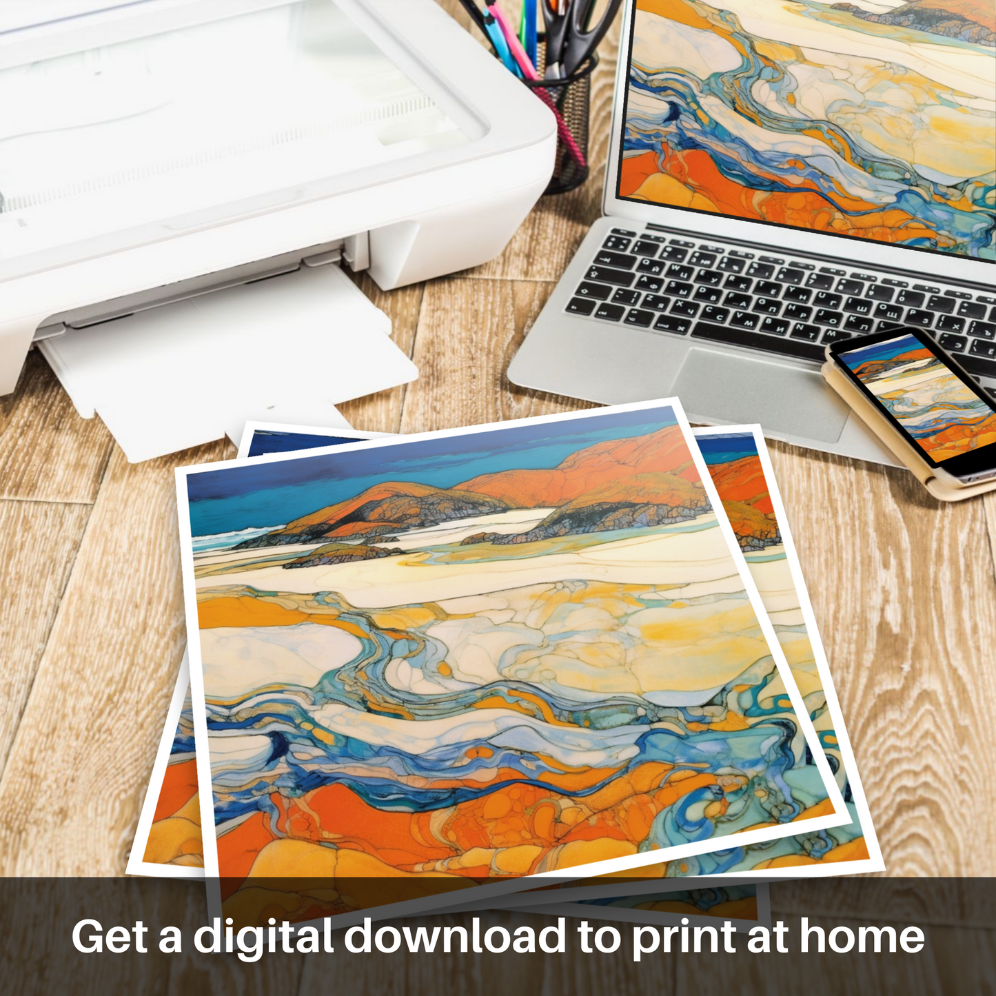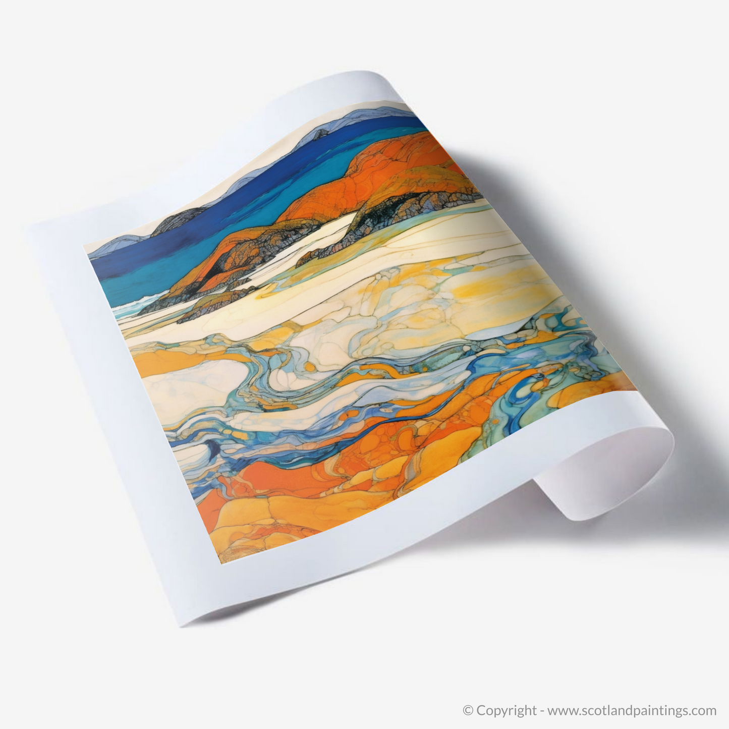 Immerse yourself in the serene beauty of Traigh Mhor, Isle of Barra, captured in this exquisite art print inspired by the unmistakable grace of the Art Nouveau movement. The sweeping curves and rich, organic forms are juxtaposed against the vivid, undulating beauty of this Scottish beach, making it a visual symphony that soothes the soul.