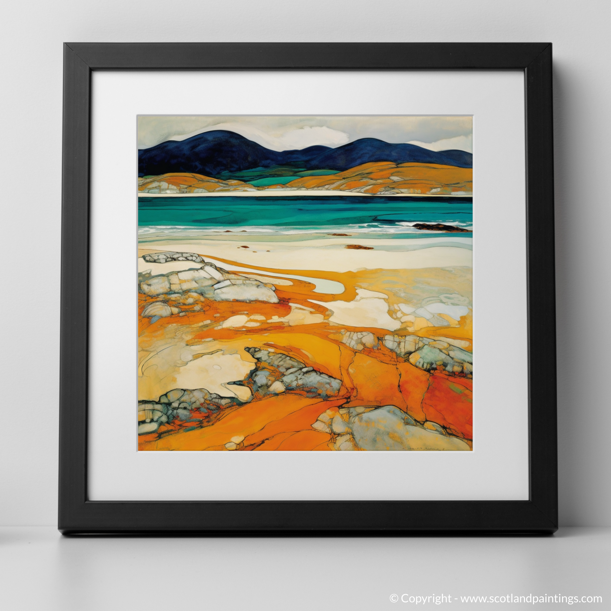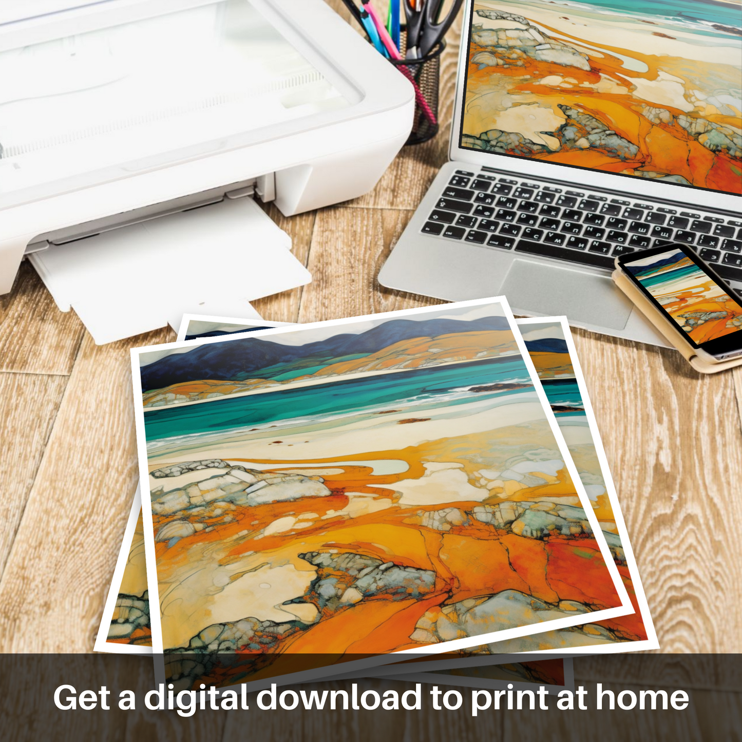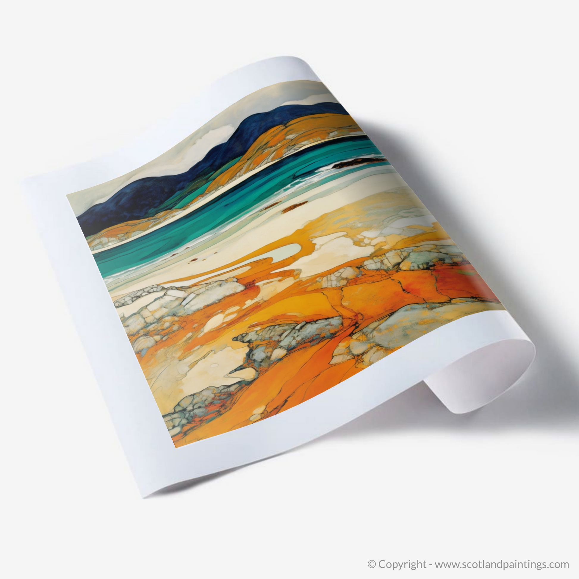 Capturing the breathtaking allure of Traigh Mhor, this exquisite print embodies the enchanting beauty of one of Scotland's most pristine beaches. The eye is immediately drawn to the harmonious blend of rich orange and creamy sand tones that dance across the canvas, intermingled with the delicate tracery of light-reflecting pools and rivulets created by the ebbing tide.