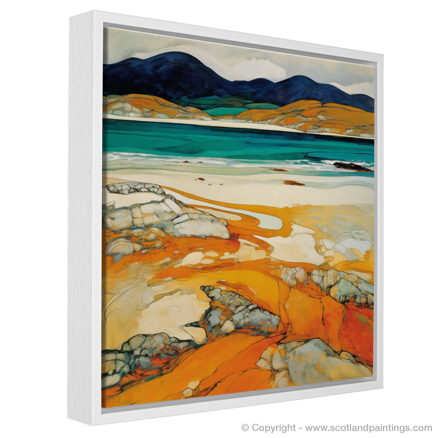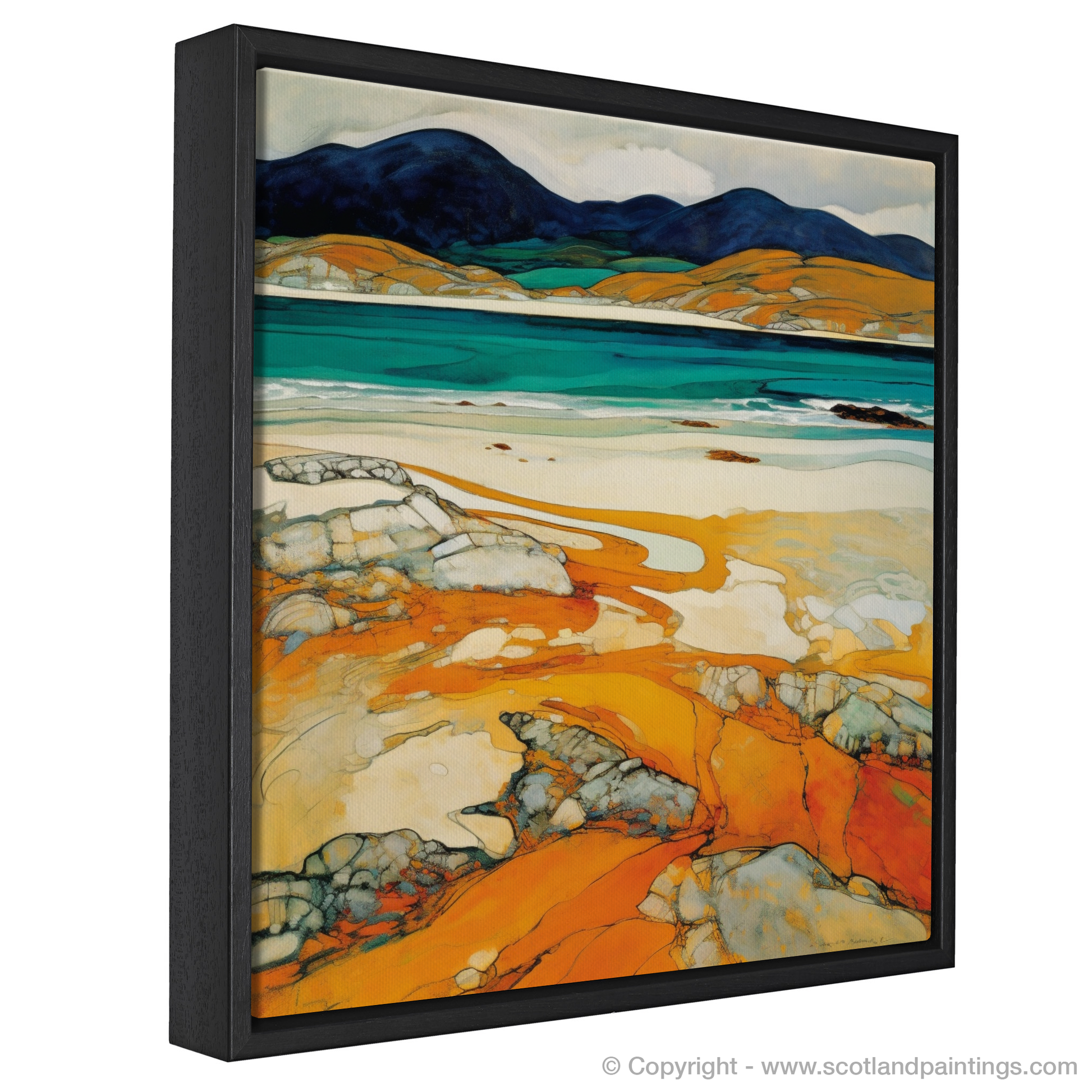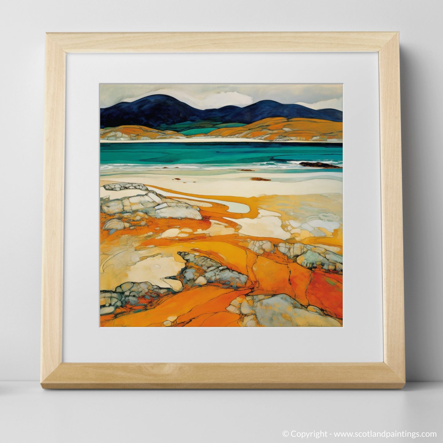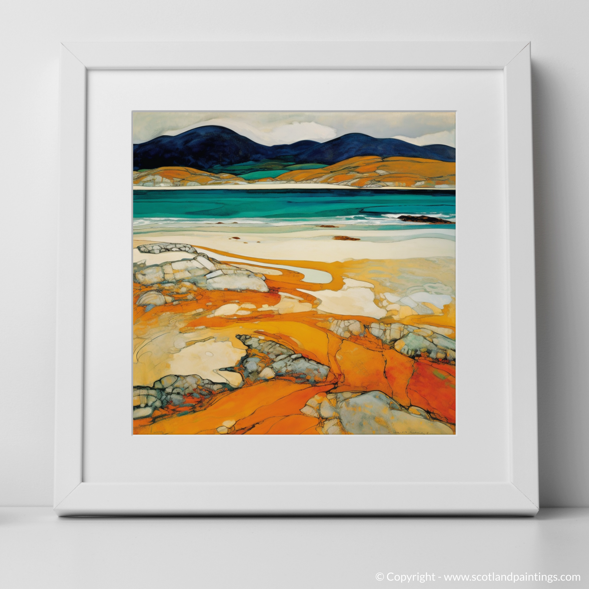 Capturing the breathtaking allure of Traigh Mhor, this exquisite print embodies the enchanting beauty of one of Scotland's most pristine beaches. The eye is immediately drawn to the harmonious blend of rich orange and creamy sand tones that dance across the canvas, intermingled with the delicate tracery of light-reflecting pools and rivulets created by the ebbing tide.