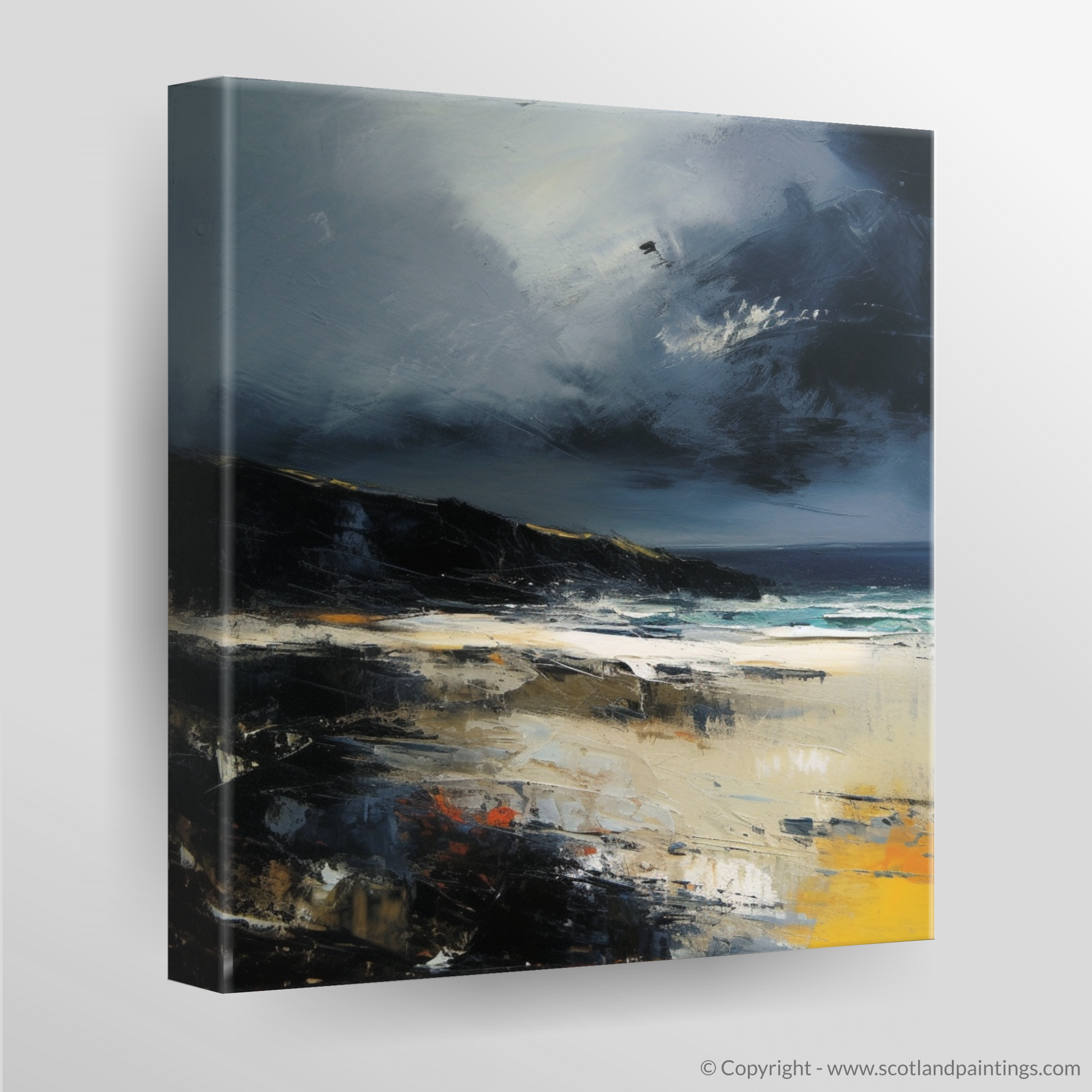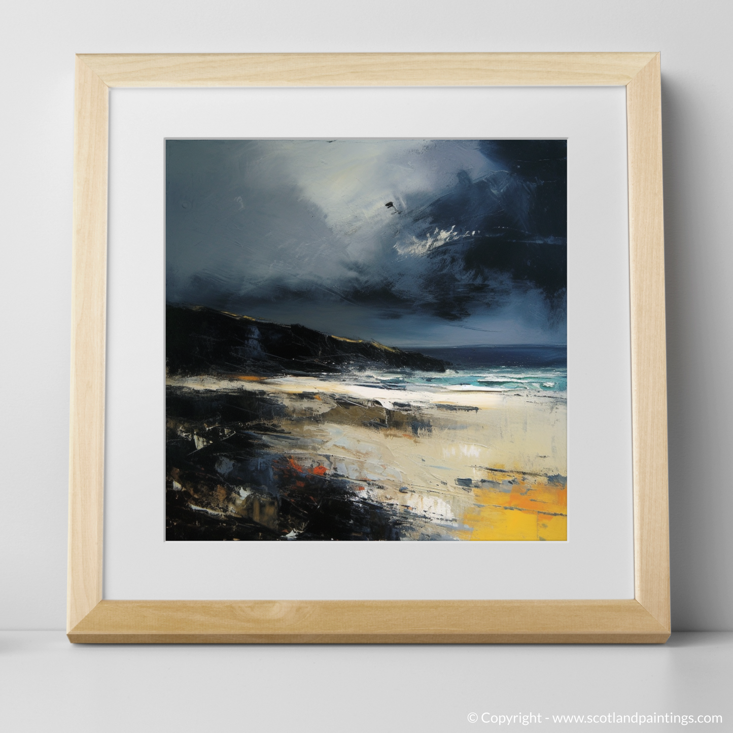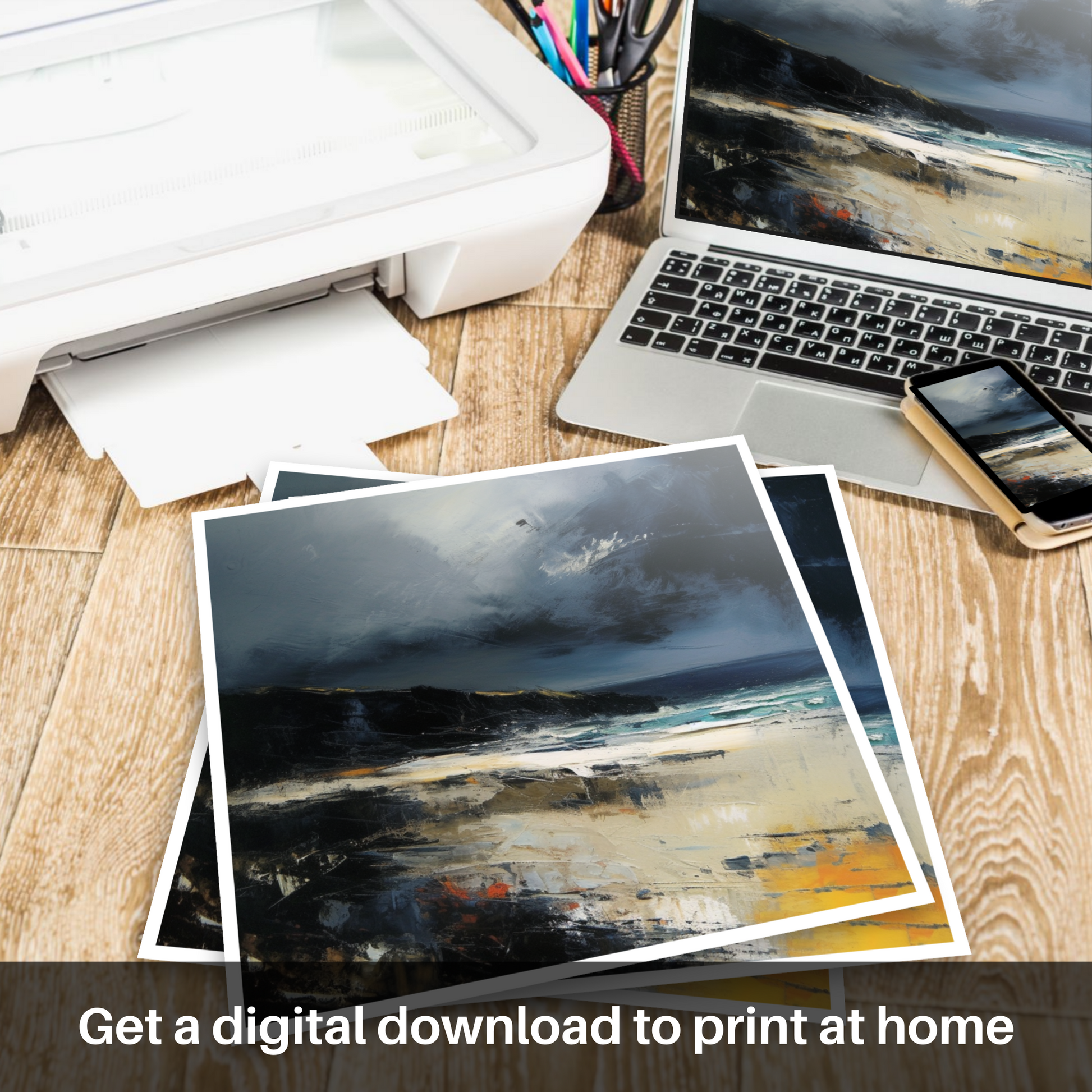 Embrace the elemental power of the Scottish shores with this evocative abstract print that captures the raw beauty of Durness Beach under a tempestuous sky. This mesmerising piece invites viewers into a dramatic landscape where wild weather and untamed nature converge.