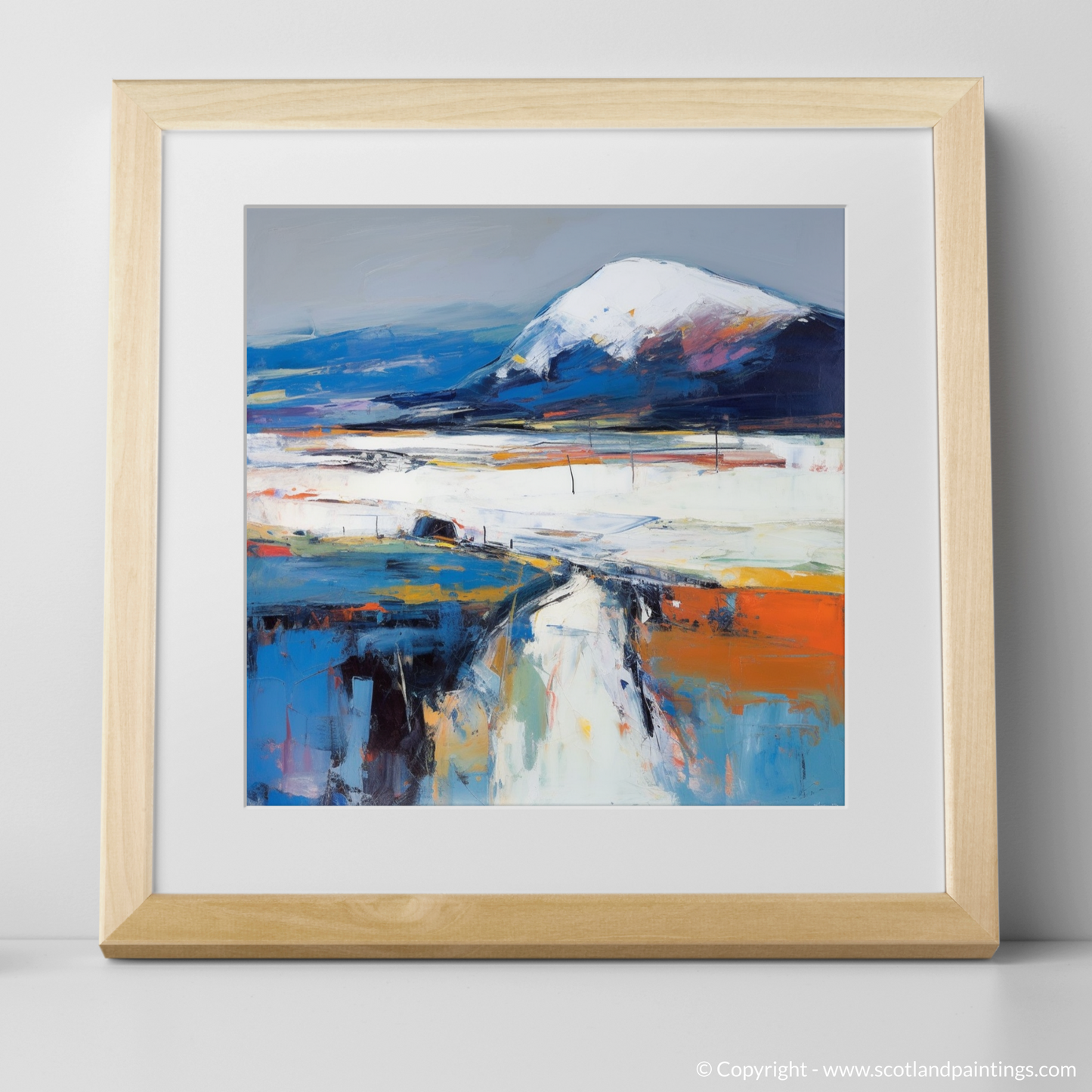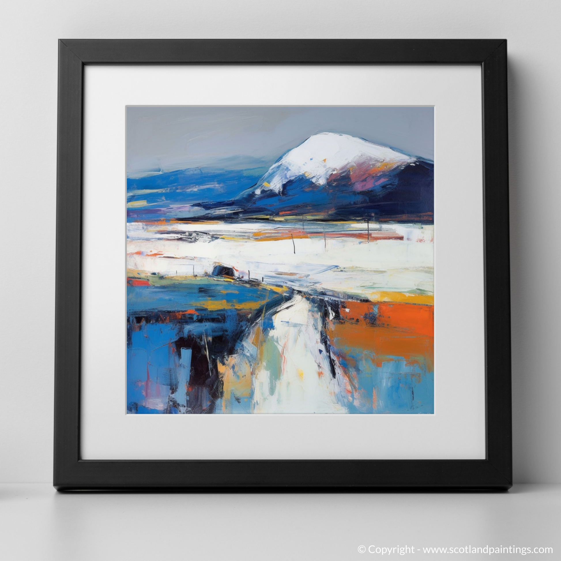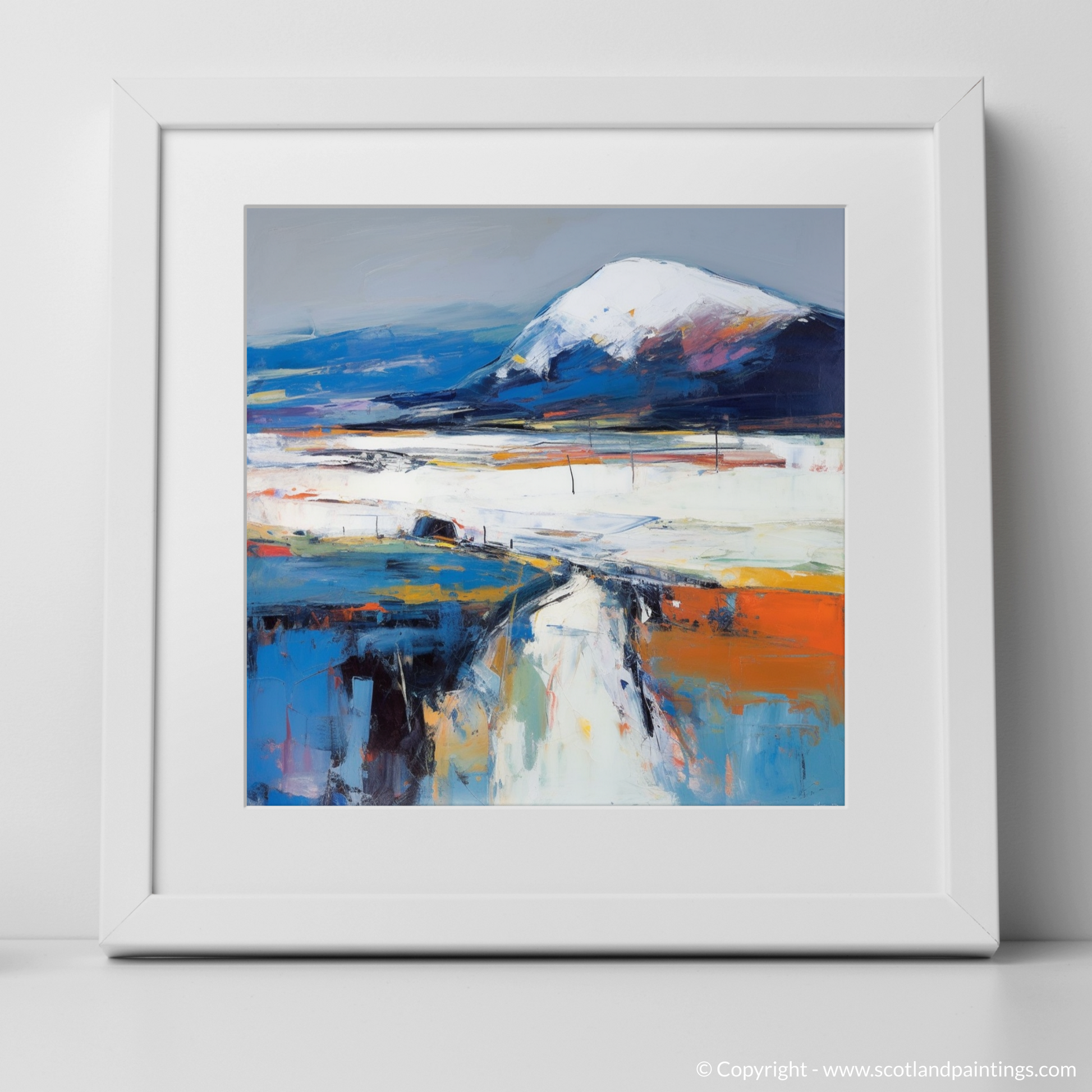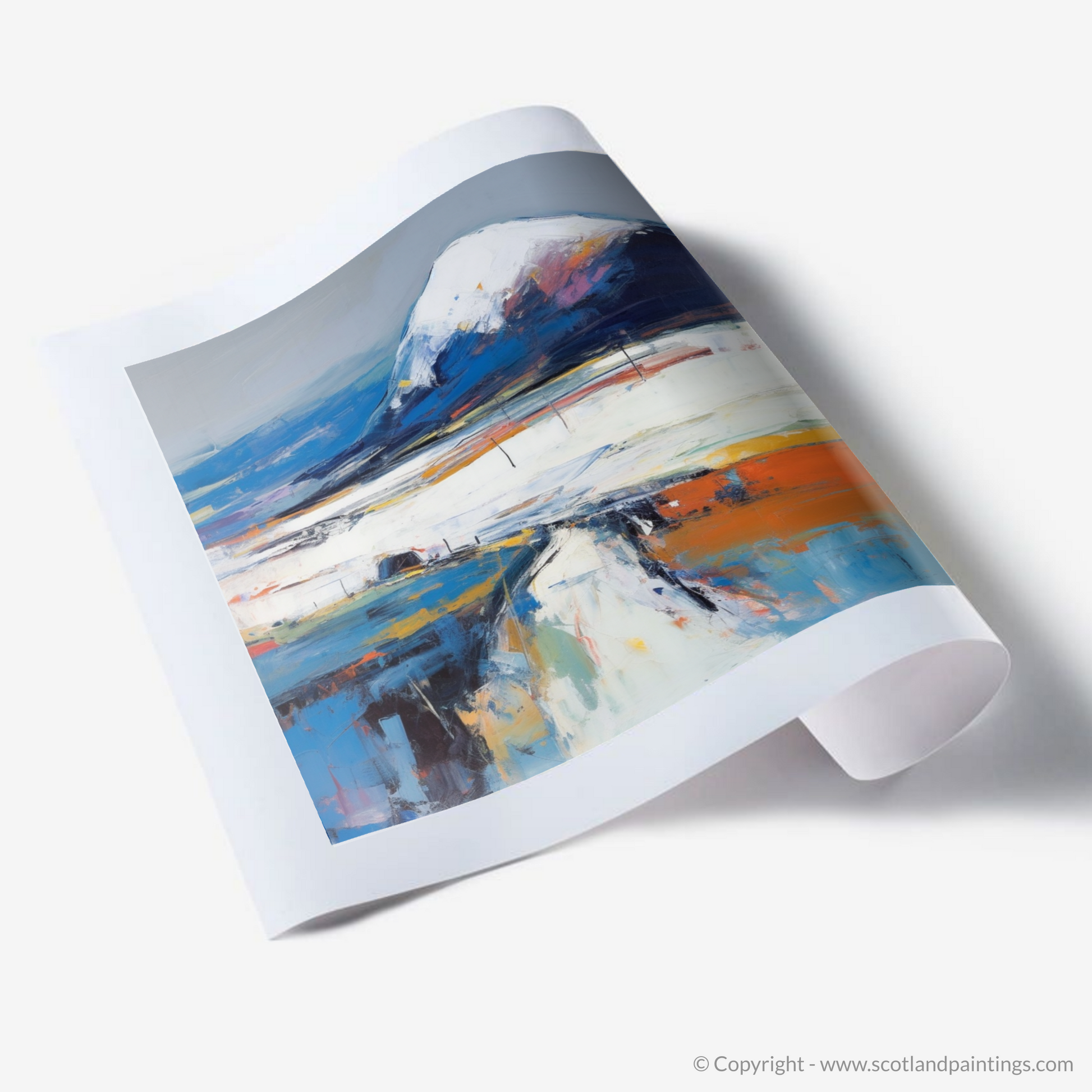 Your eyes are immediately drawn to the commanding presence of the mountain, Beinn Bhàn, its peak dusted with ethereal whites suggesting snow or mist, transcending a base of deep blues and purple hues—echoes of the moody Scottish sky. The landscape unfolds beneath it in a symphony of colour, where layered brushstrokes of white, burnt orange, and azure portray the rugged terrain with a tantalising vivacity.