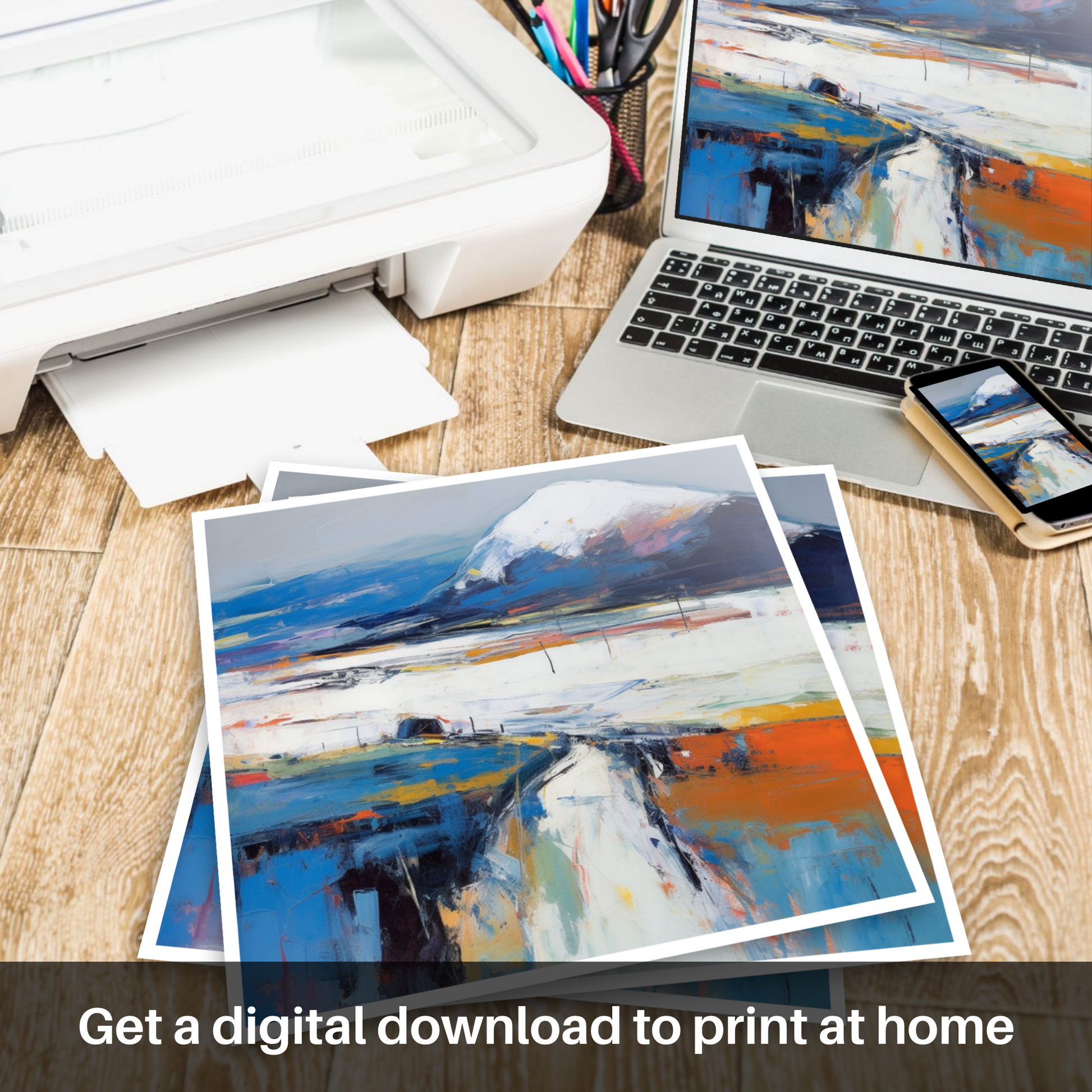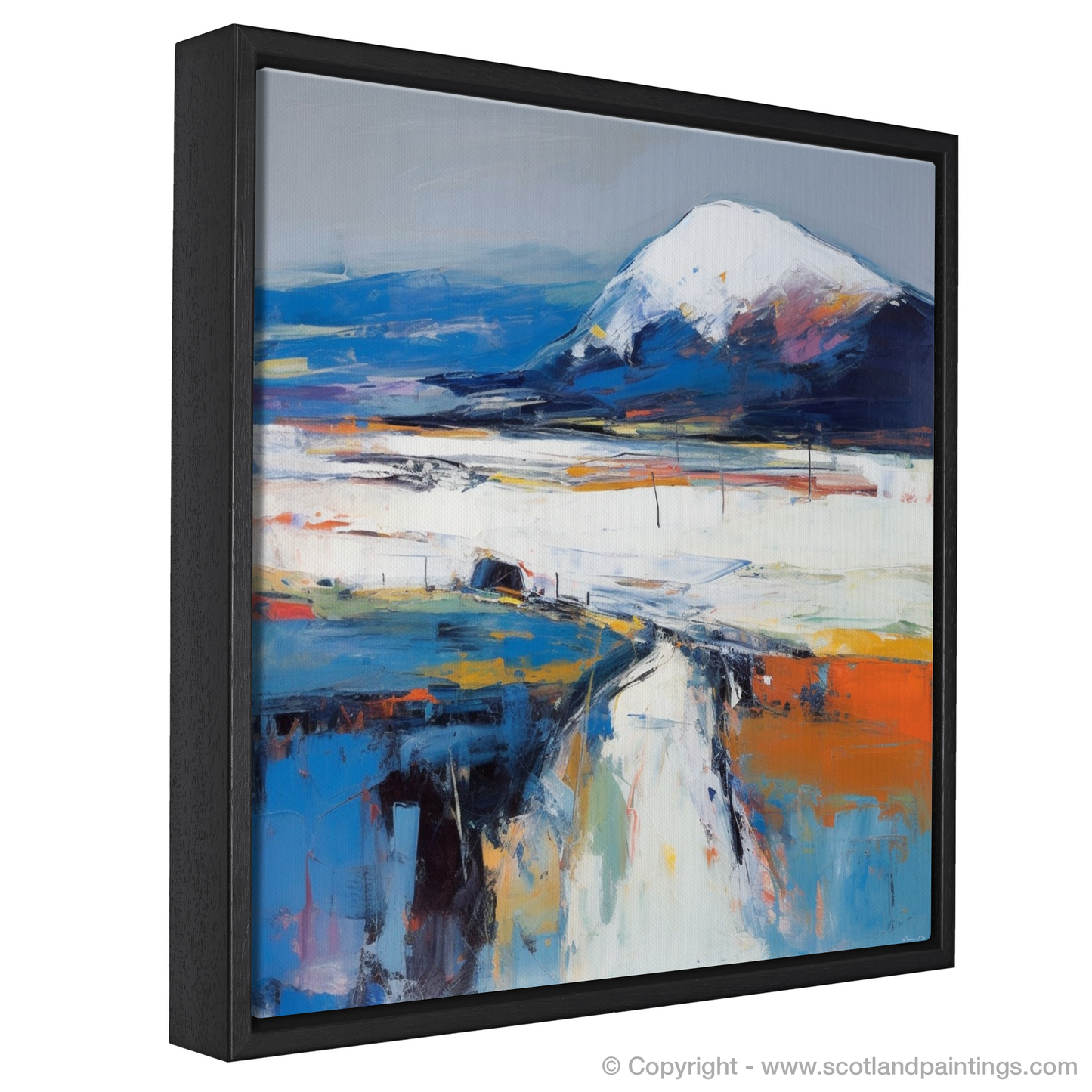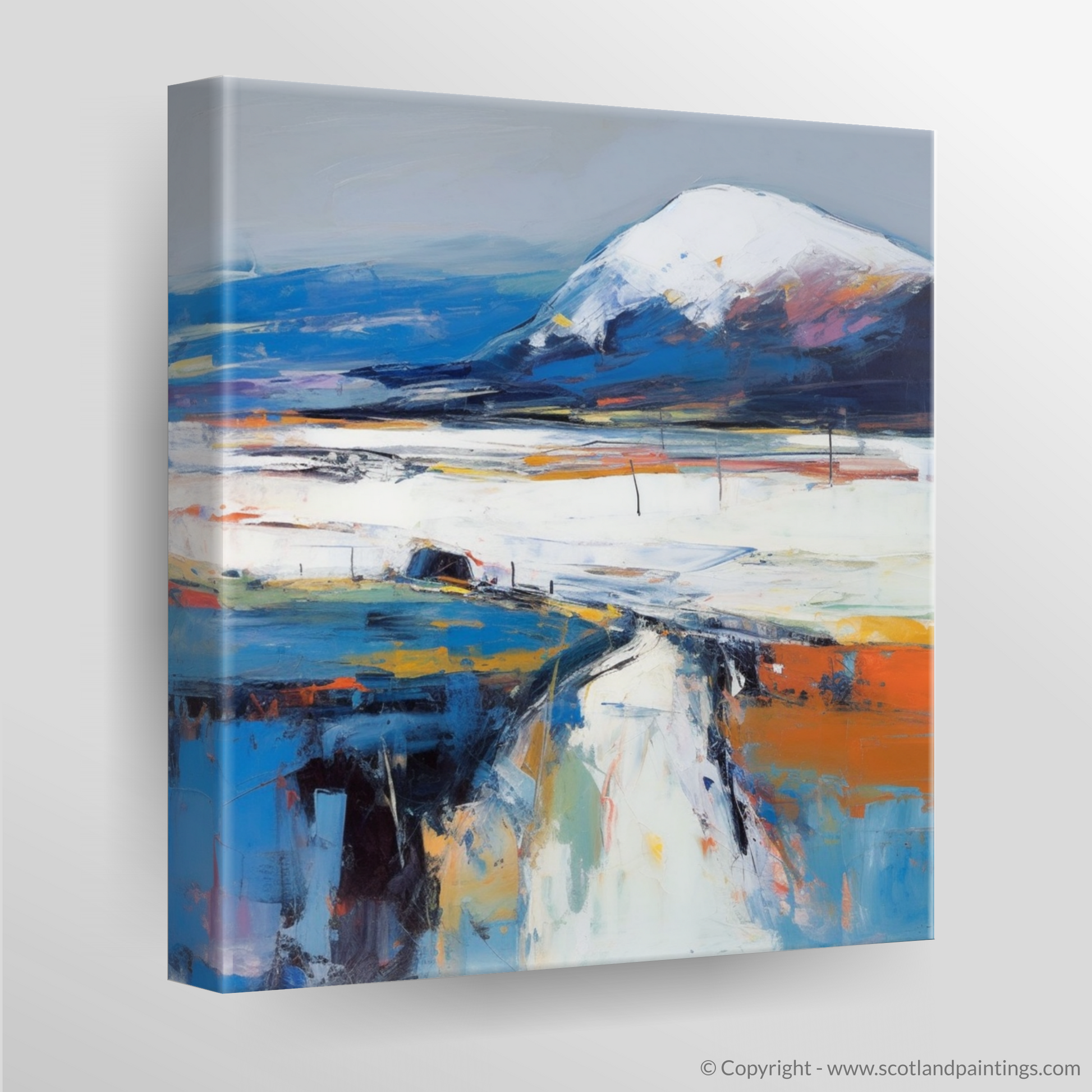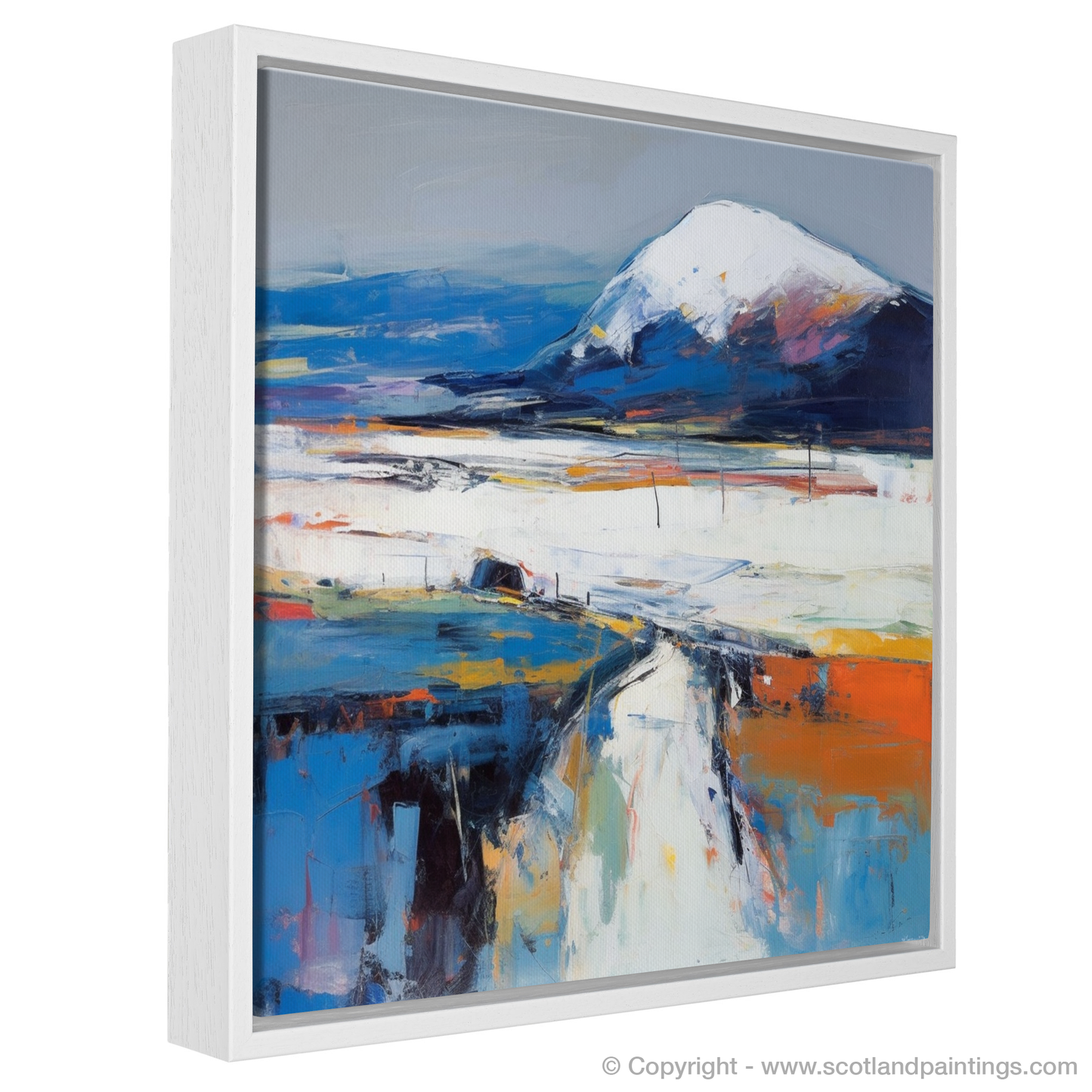 Your eyes are immediately drawn to the commanding presence of the mountain, Beinn Bhàn, its peak dusted with ethereal whites suggesting snow or mist, transcending a base of deep blues and purple hues—echoes of the moody Scottish sky. The landscape unfolds beneath it in a symphony of colour, where layered brushstrokes of white, burnt orange, and azure portray the rugged terrain with a tantalising vivacity.