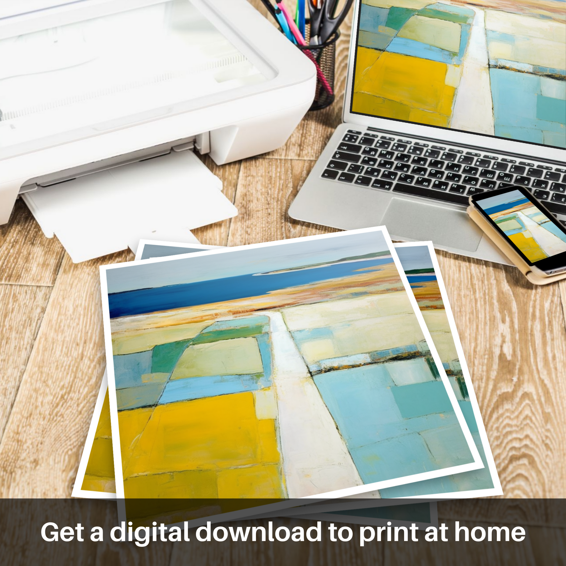 Dive into the dynamic embrace of land and sea with our evocative abstract interpretation of Gullane Beach. This exquisite piece captivates with its bold interpretation of nature's palette, where earthy tones of ochre and sand meet the vivid azures and deep navies of the Scottish shoreline.