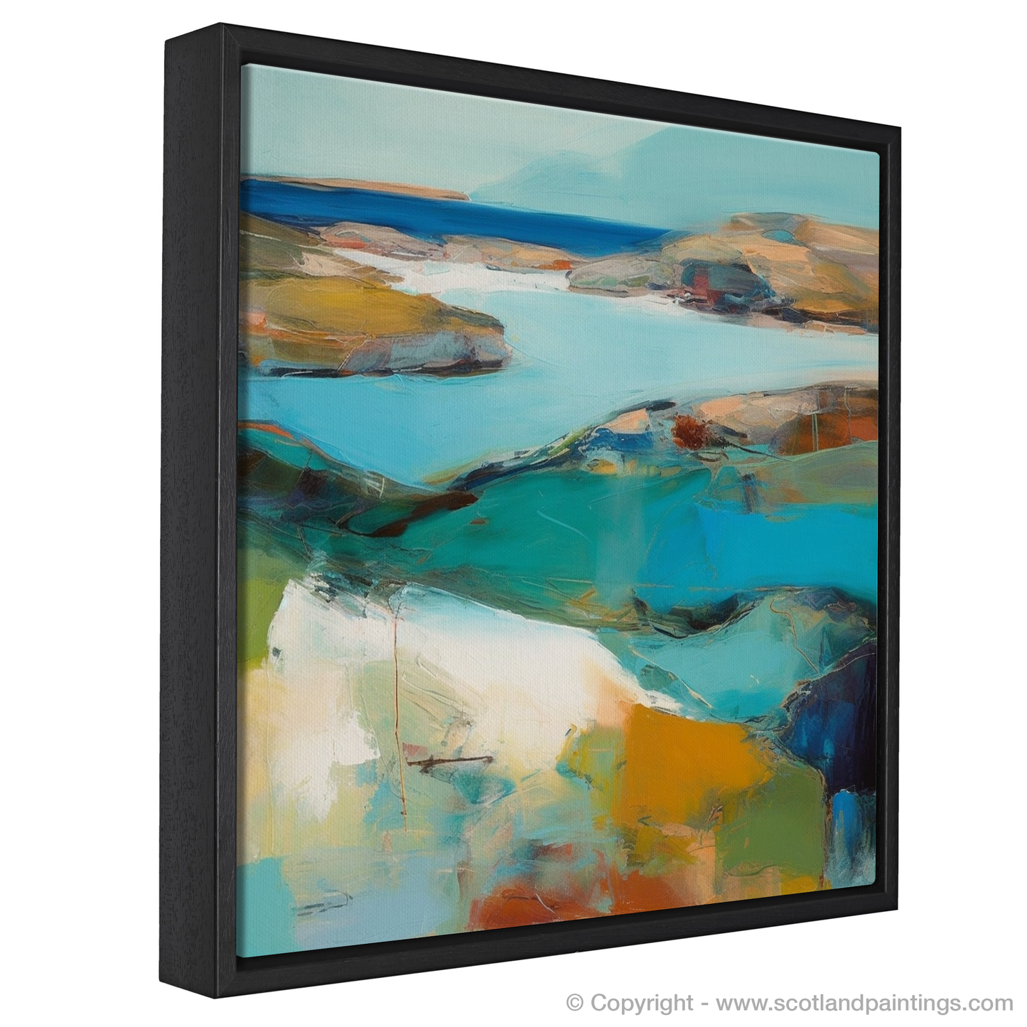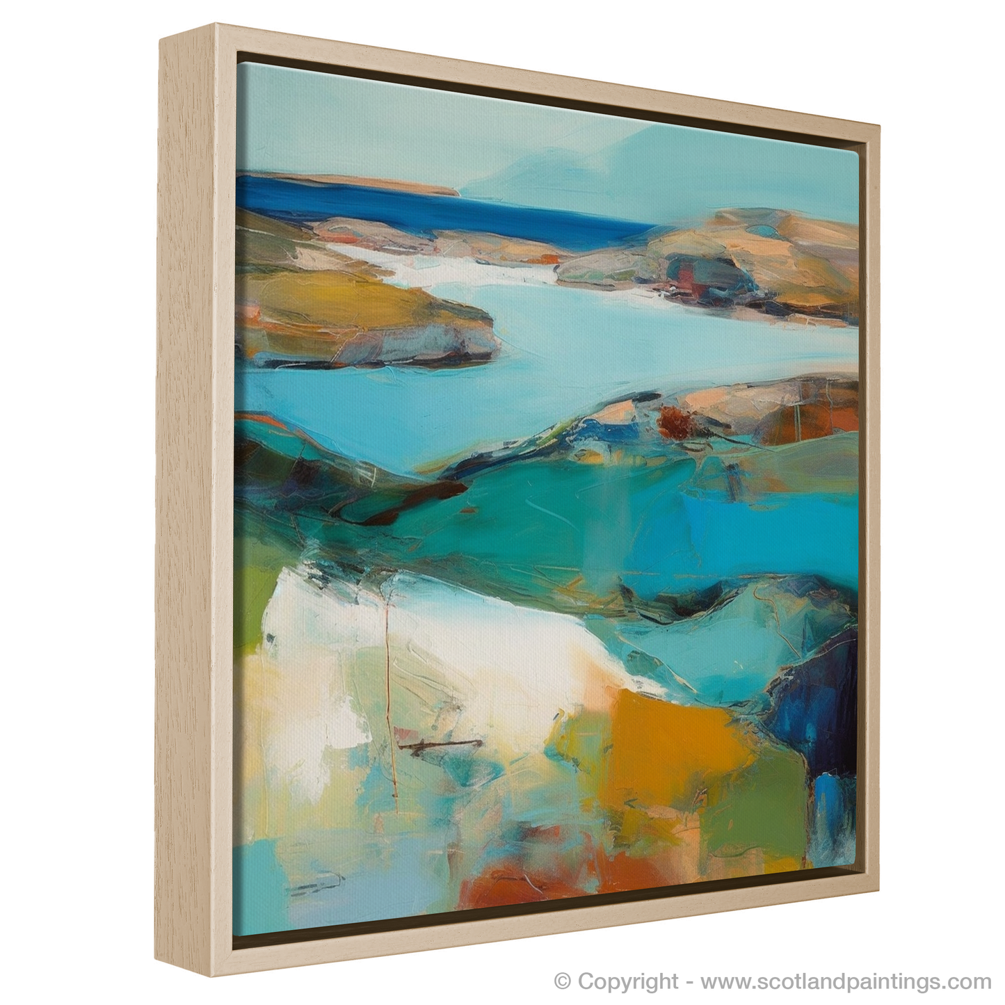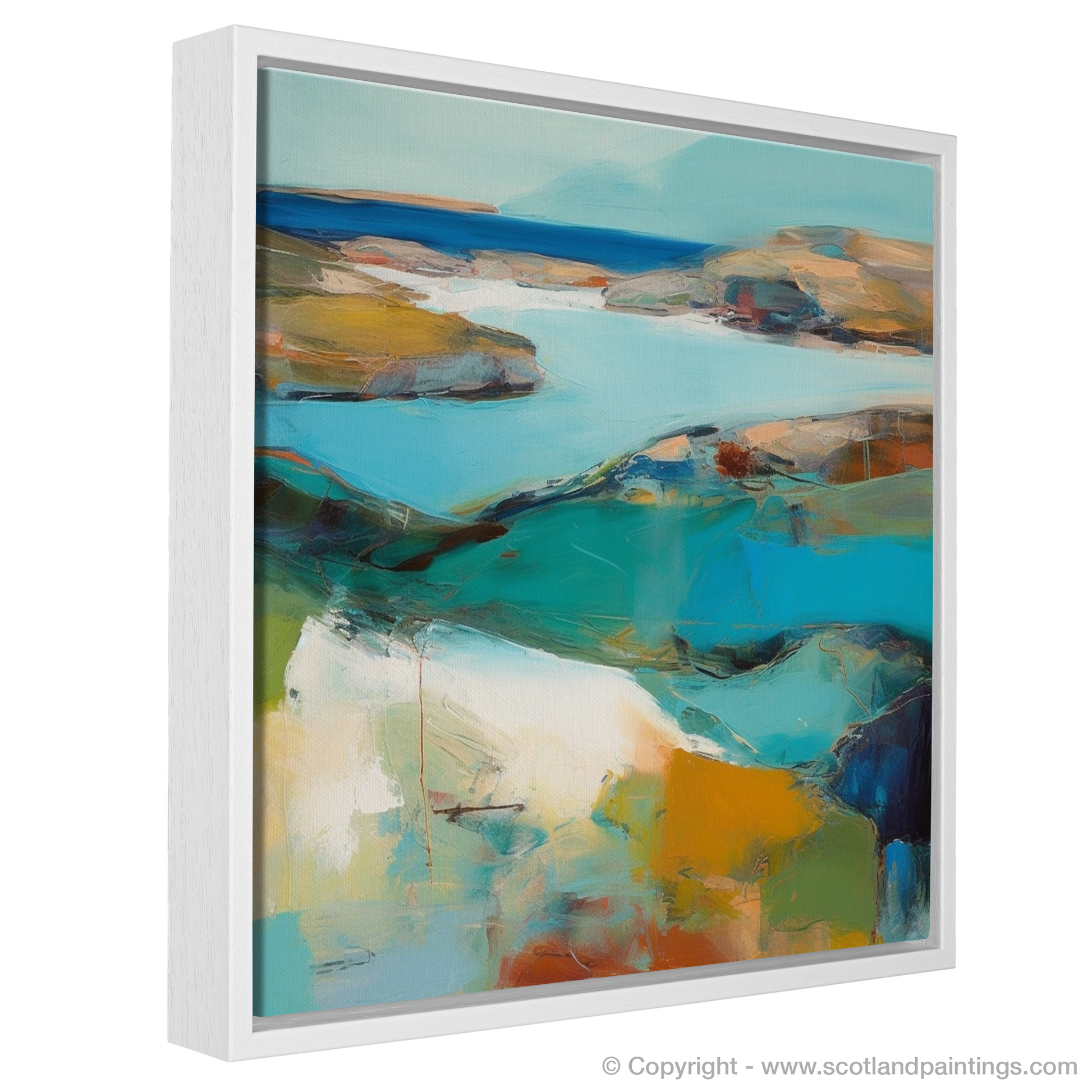 Immerse yourself in the quintessential charm of Scotland's natural beauty with this evocative print, a piece capturing the essence and tranquillity of Achmelvich Bay in Sutherland, reimagined through the lens of Abstract Impressionism. The artwork invites onlookers into a serene landscape where broad, gestural brushstrokes meld with a soothing, yet lively, palette.