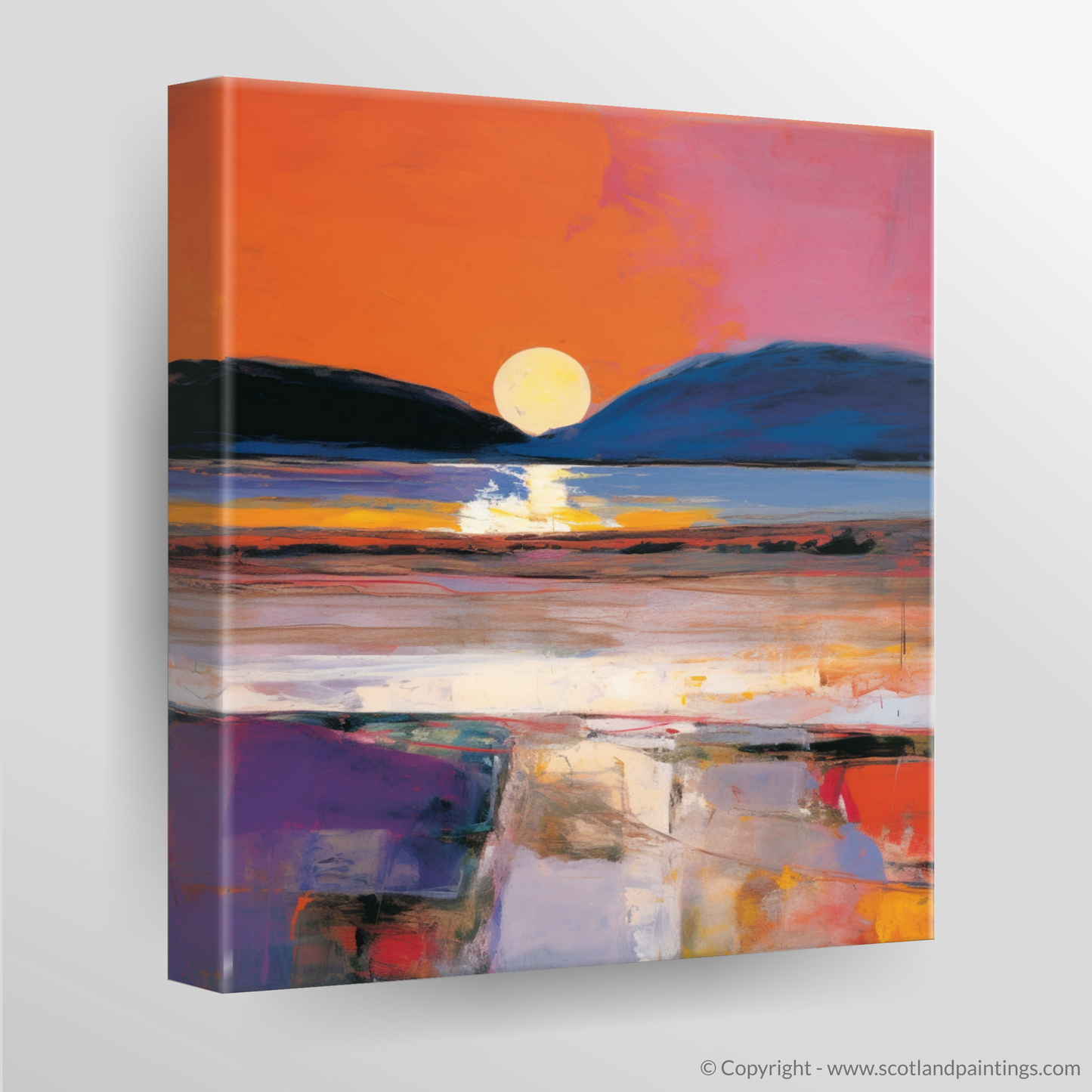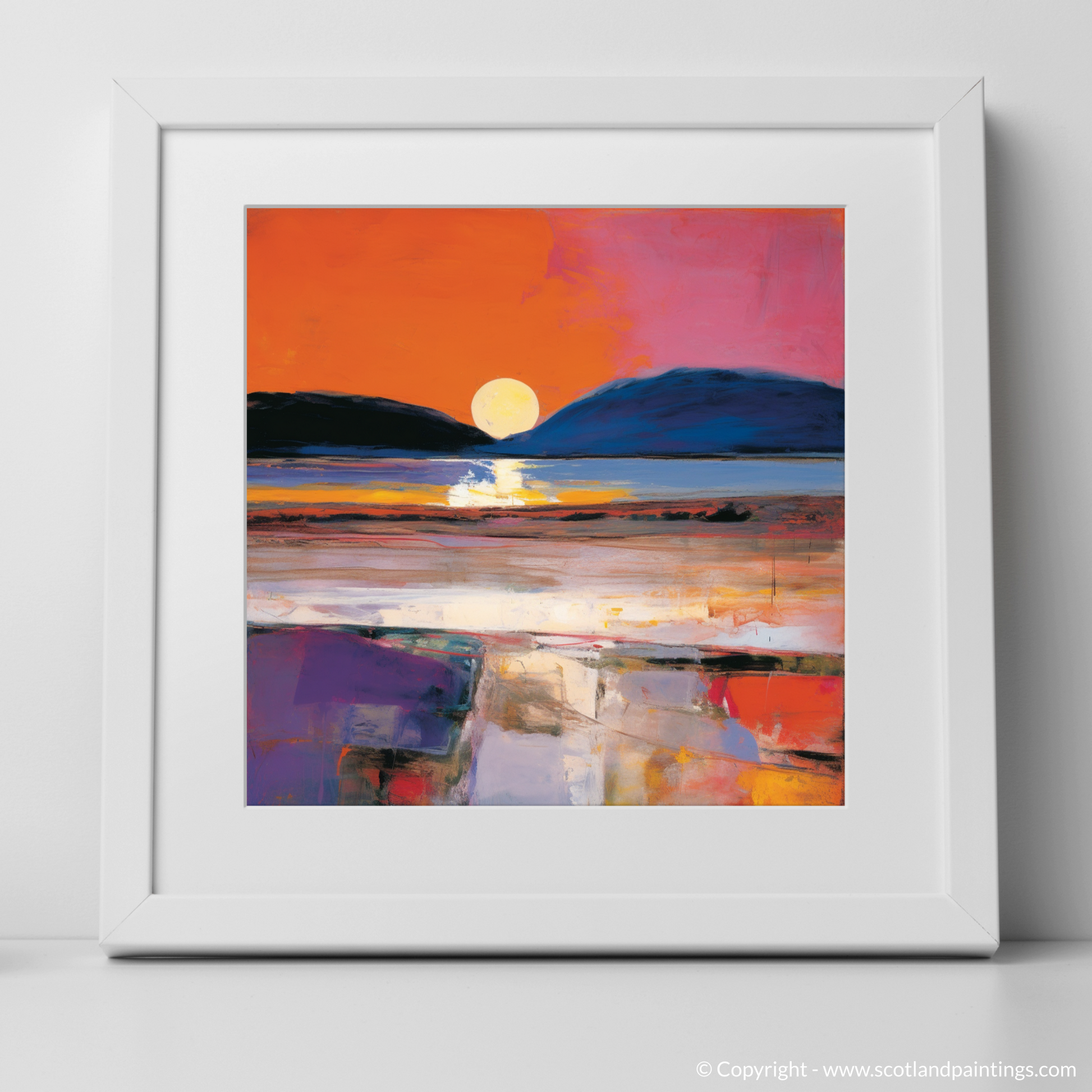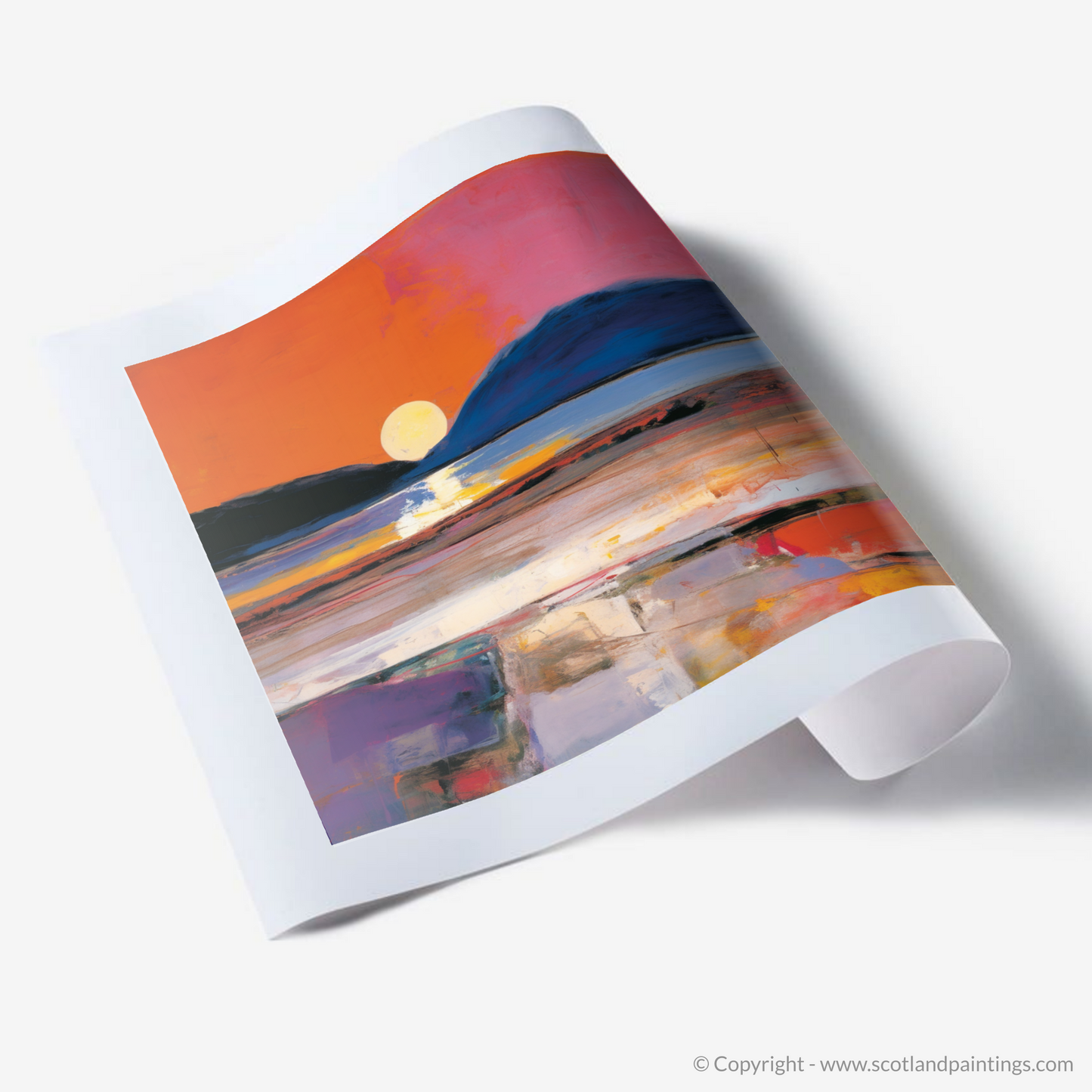 Immerse yourself in the vibrant splendour of a Scottish cove at the day's end with this captivating print. Evoking the serene yet dynamic atmosphere of Traigh Mhor, the artist employs a bold fusion of hues, reflecting the fiery descent of the sun below the horizon. An ethereal orb of soft yellow, the setting sun is mirrored on the water's surface, presenting a stark contrast against the deepening shades of the night sky.